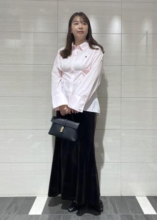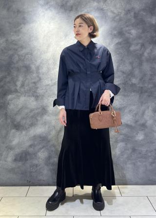王道のシャツを着るだけで決まるものに仕上げるために、メンズライクなサイズ感のシャツにウエストタックをいれ体のラインを綺麗にみせてくれるデザインにしました。