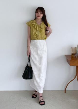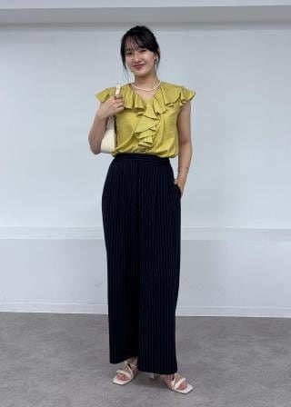一枚でサマになるフリルブラウスで通勤服にも華やかさをプラスしてくれます。