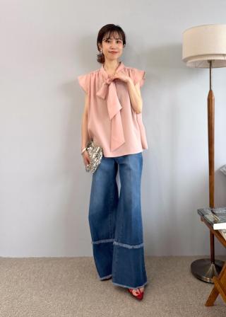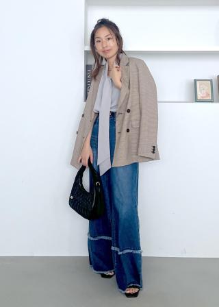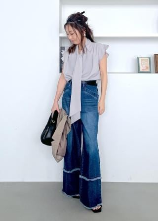 オフの日は、デニムやワイドパンツでカジュアルダウンしても◎。インでもアウトでも着映えするデザインのため、ウエストインでスタイルアップ見せ、アウトでリラックス感を演出など気分に合わせたアレンジが可能です。