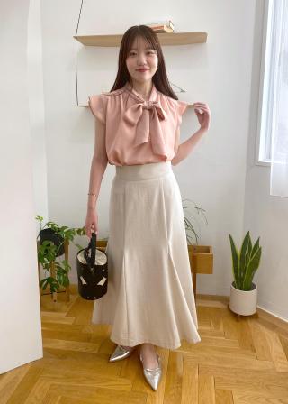 首元のボウタイが顔まわりを華やかに見せてくれる、大人のためのノースリーブブラウス。