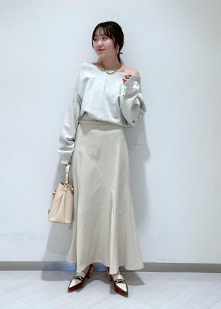 今年のスタイリングのおすすめは、シャツインしてワンオフショルダーでスウェットを上に重ねるスタイル!