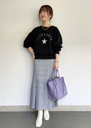 例えば、オレンジカラースウェット×オレンジ系柄スカート、ラベンダーカラースウェット×ラベンダーアクセント柄スカートなどと楽しめます◎