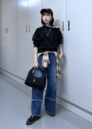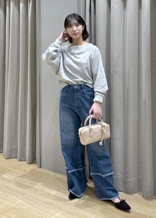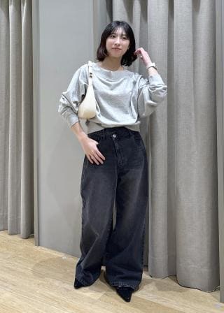 普通に着るとやや広めなボートネックのようなシルエットでした。襟元が開きすぎないので大人女子でもカジュアルに着回せます◎今っぽくゆるっとオフショルで着ると一気に女性らしく着こなせます!