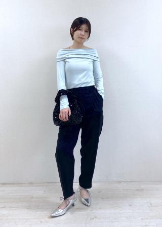 デコルテを見せる女性らしさの詰まったアイテムなので、トラックパンツやワークパンツなどのカジュアルボトムと合わせてスタイリングして頂くのがおすすめです。