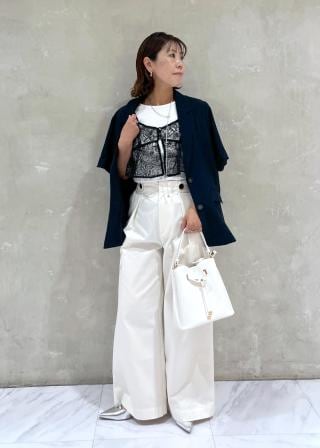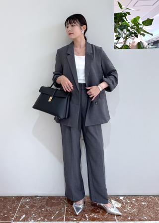 ジャケットインでネックレスをさりげなくアレンジするシンプル大人スタイリング。