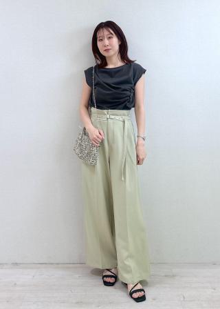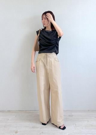 インに出来る位置でドレープを止めているので様々なボトムスと相性抜群。