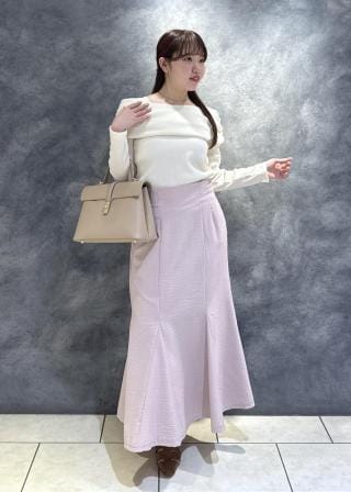 オフショル部分が華やかなのでボトムは腰回りがすっきりしているものと好相性。少しカジュアルな印象なのでジャケットの中に着てオフィスカジュアルスタイルも楽しめます。