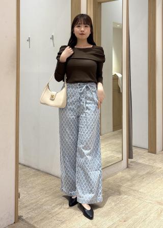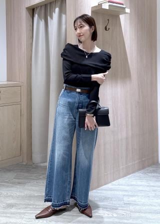 オフショル部分が華やかなのでボトムは腰回りがすっきりしているものと好相性。少しカジュアルな印象なのでジャケットの中に着てオフィスカジュアルスタイルも楽しめます。