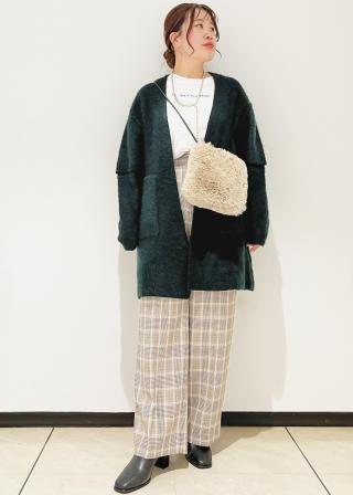 身長158cm、着丈はおしりがすっぽり隠れるほどで、袖丈は手の甲までかかるほどのゆったり長め丈。