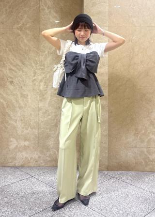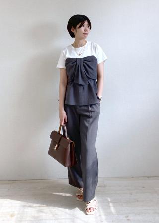 ペプラムシルエットなので、ワイドパンツやIラインスカートがオススメです。