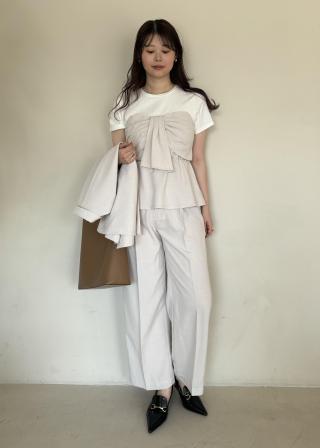 ペプラムシルエットなので、ワイドパンツやIラインスカートがオススメです。
