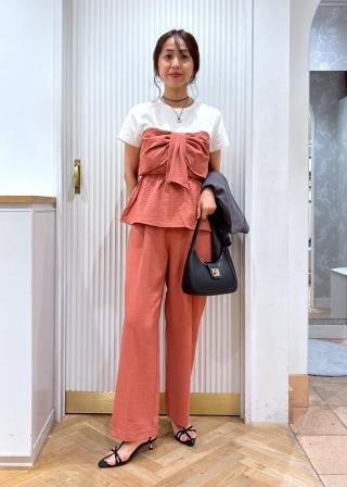 ペプラムシルエットなので、ワイドパンツやIラインスカートがオススメです。