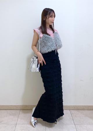 152cmでFサイズ着用して着丈はウエストくらいのやや短め丈。in、outどちらのスタイルにも◎。ややフィット感のある細身シルエットなので、ボリュームあるフリルですが広がりすぎずにお召しいただけます。パンツなどでシンプルにコーデするのがお勧めです!