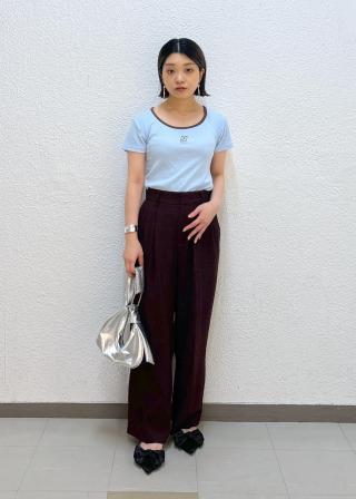 152cmのFサイズ着用し、着丈はウエスト位のやや短め丈。収縮性のある素材ですが、身体のラインを拾いすぎずに着ていただけます。