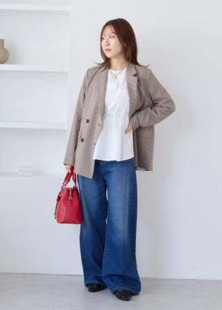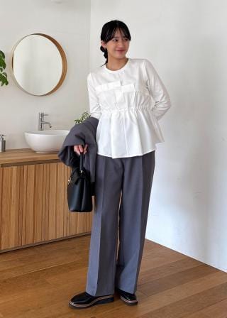 デニムパンツとも相性抜群です!ジャケットを羽織ればオフィスカジュアルなスタイリングにも。胸元にデザインと広がりがあるため、Iラインスカートやテーパードパンツなど細身のボトムと好相性です。