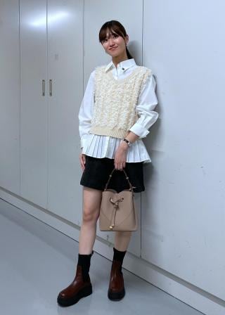 やや広めの肩とウエスト部分のリブが長めのニットベスト。1枚でぱっと決まるデザインです。