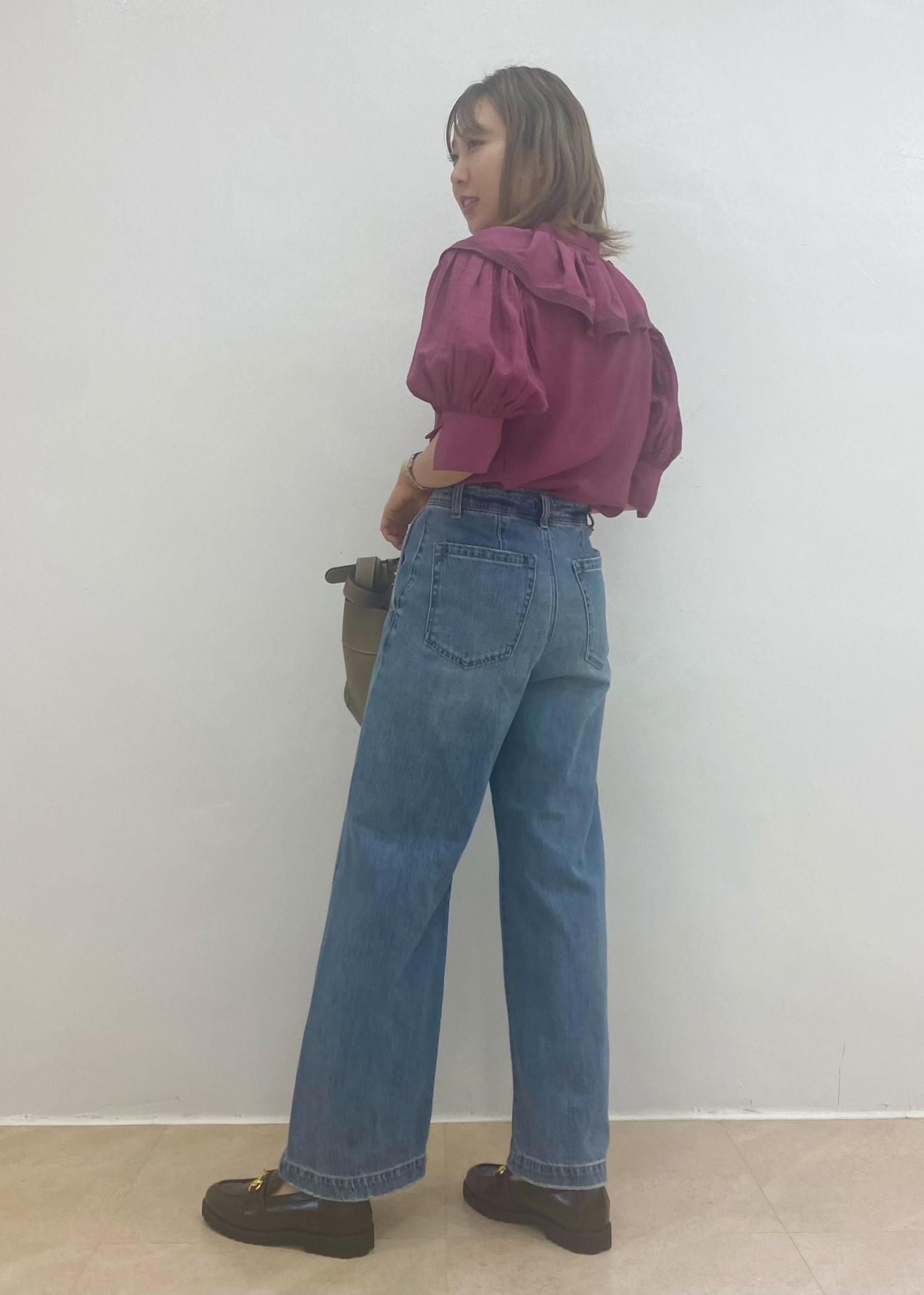 大きめな襟がポイントのブラウス♡ ブラウスが甘めな印象なので、 デニムと合わせてカジュアルなコーデにしてみました。