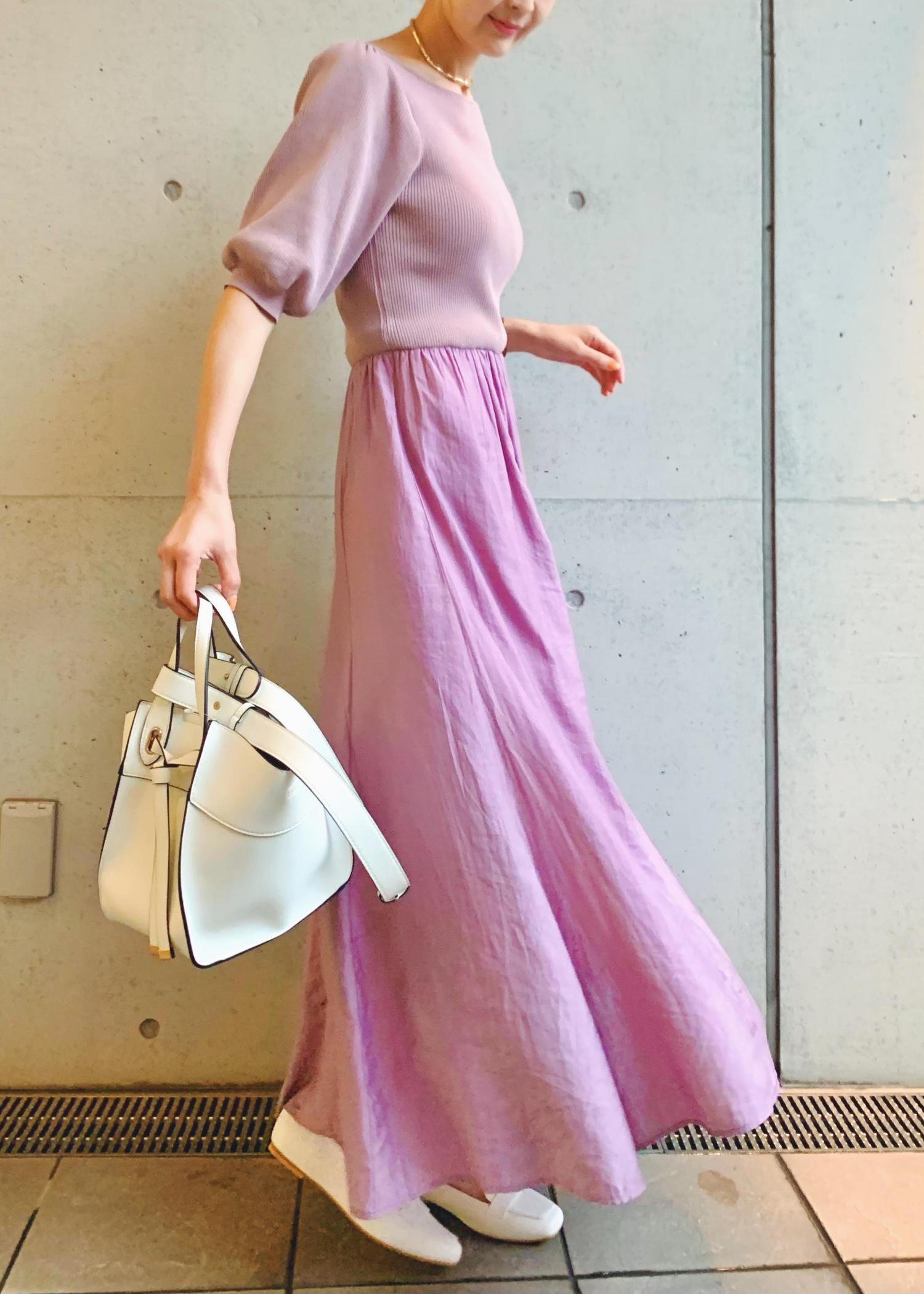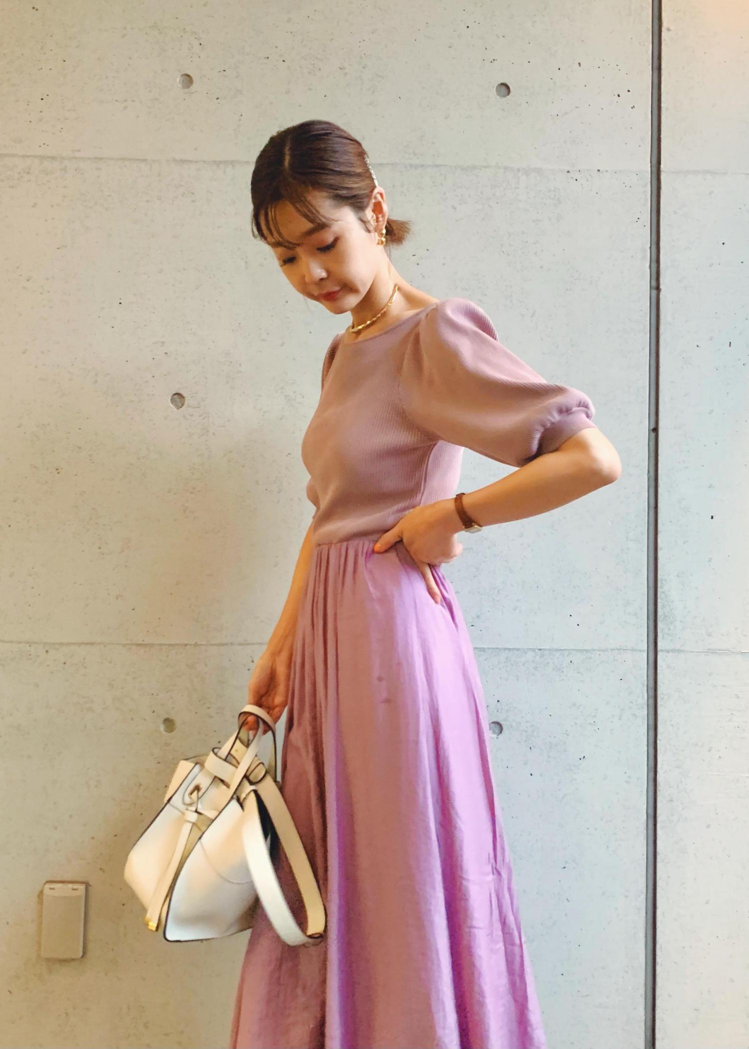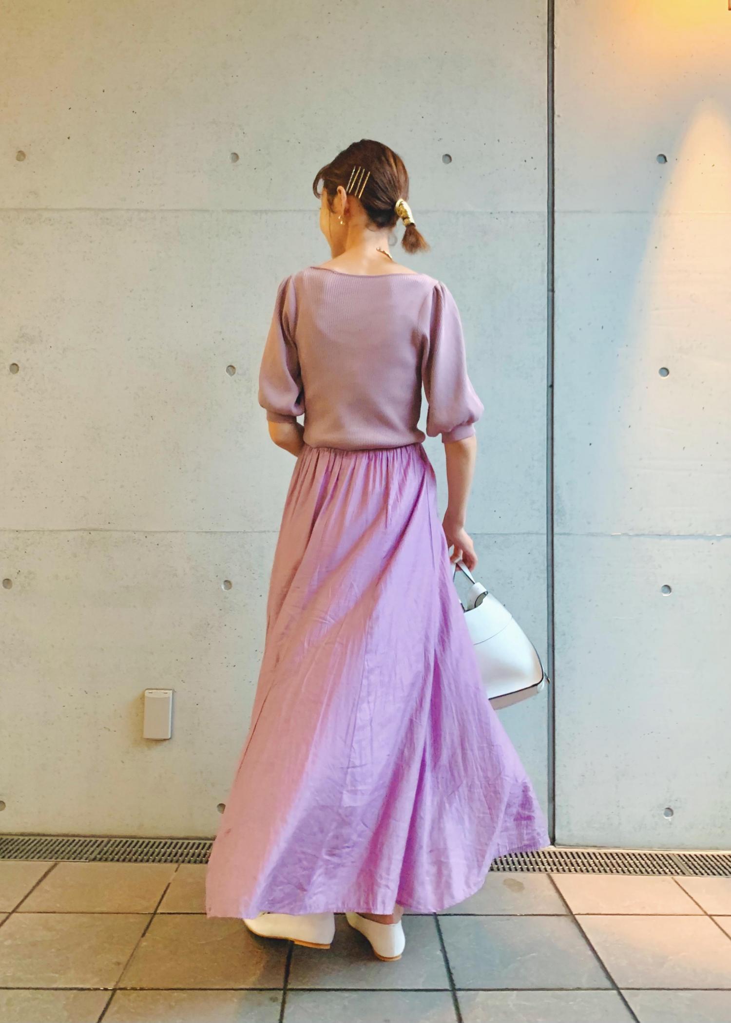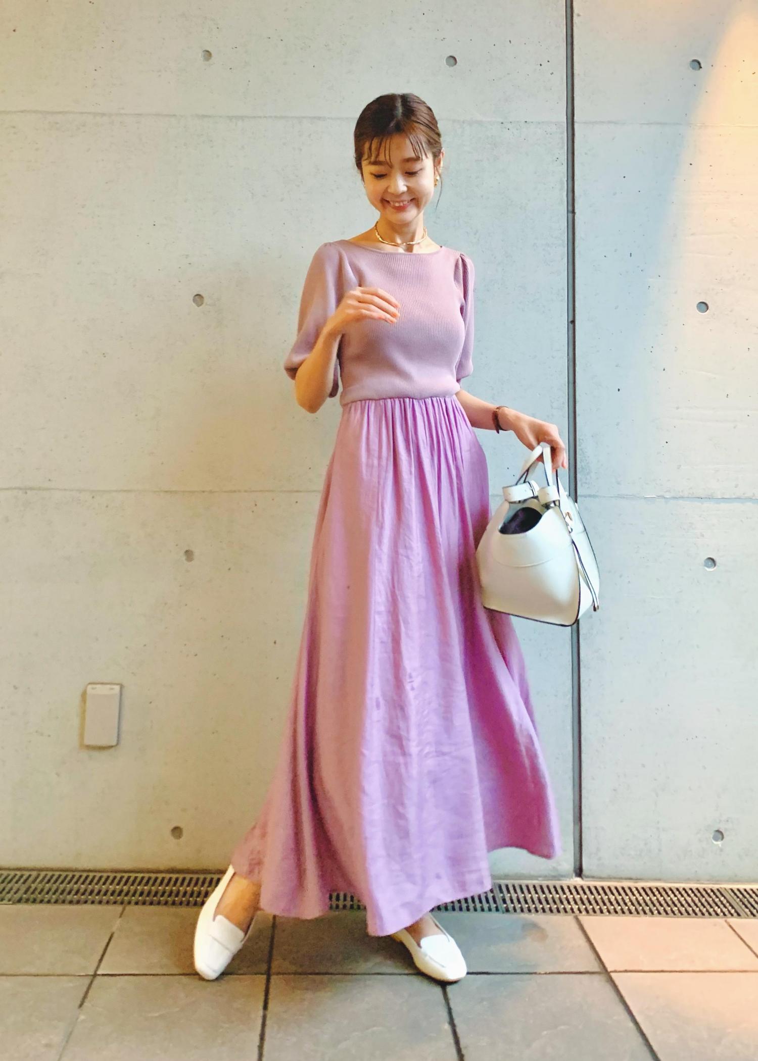 程よいフィット感とふんわりスカートで女性らしいシルエット◎