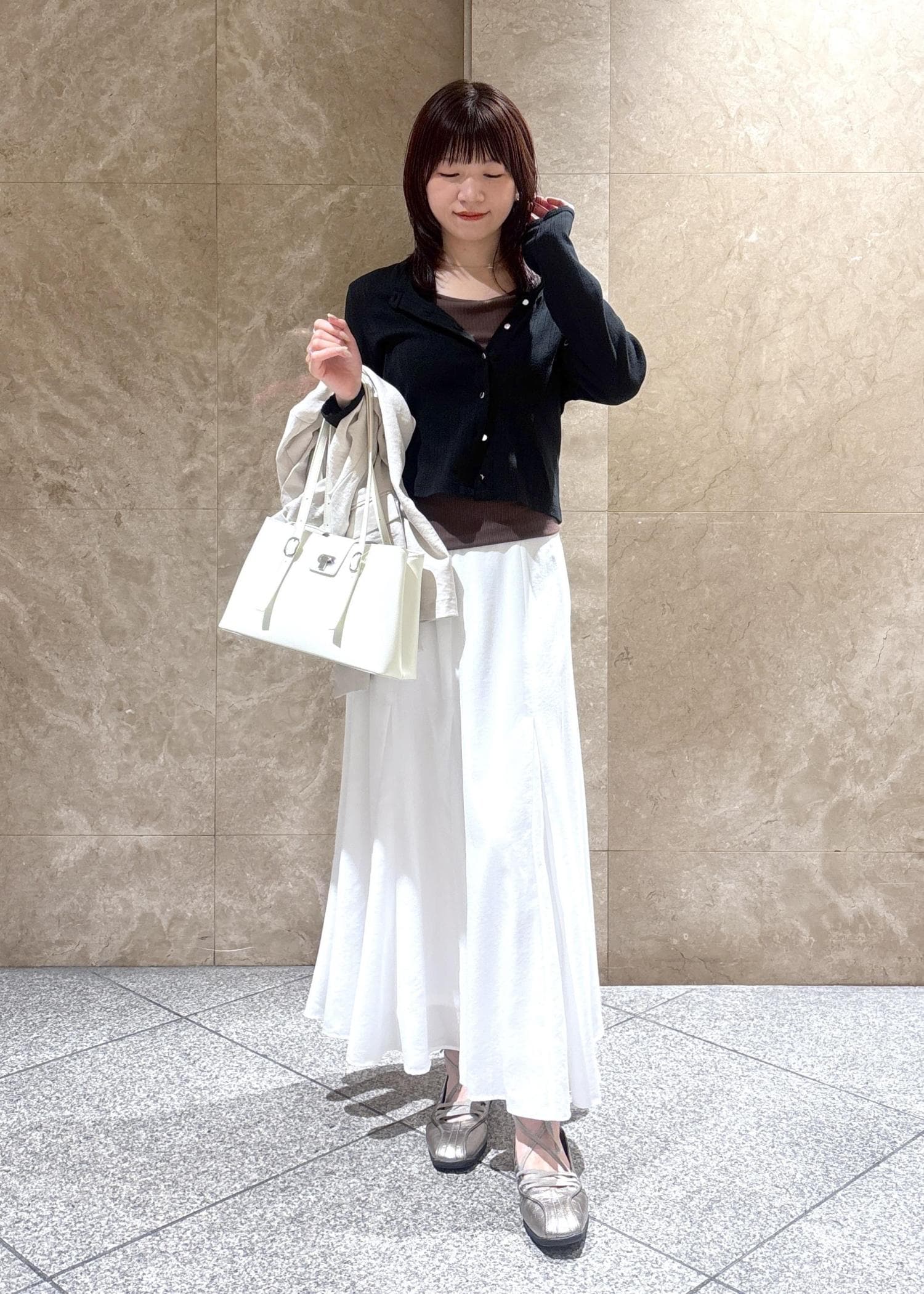 ひらっとした素材感で合わせると軽さも出るのでおすすめ。