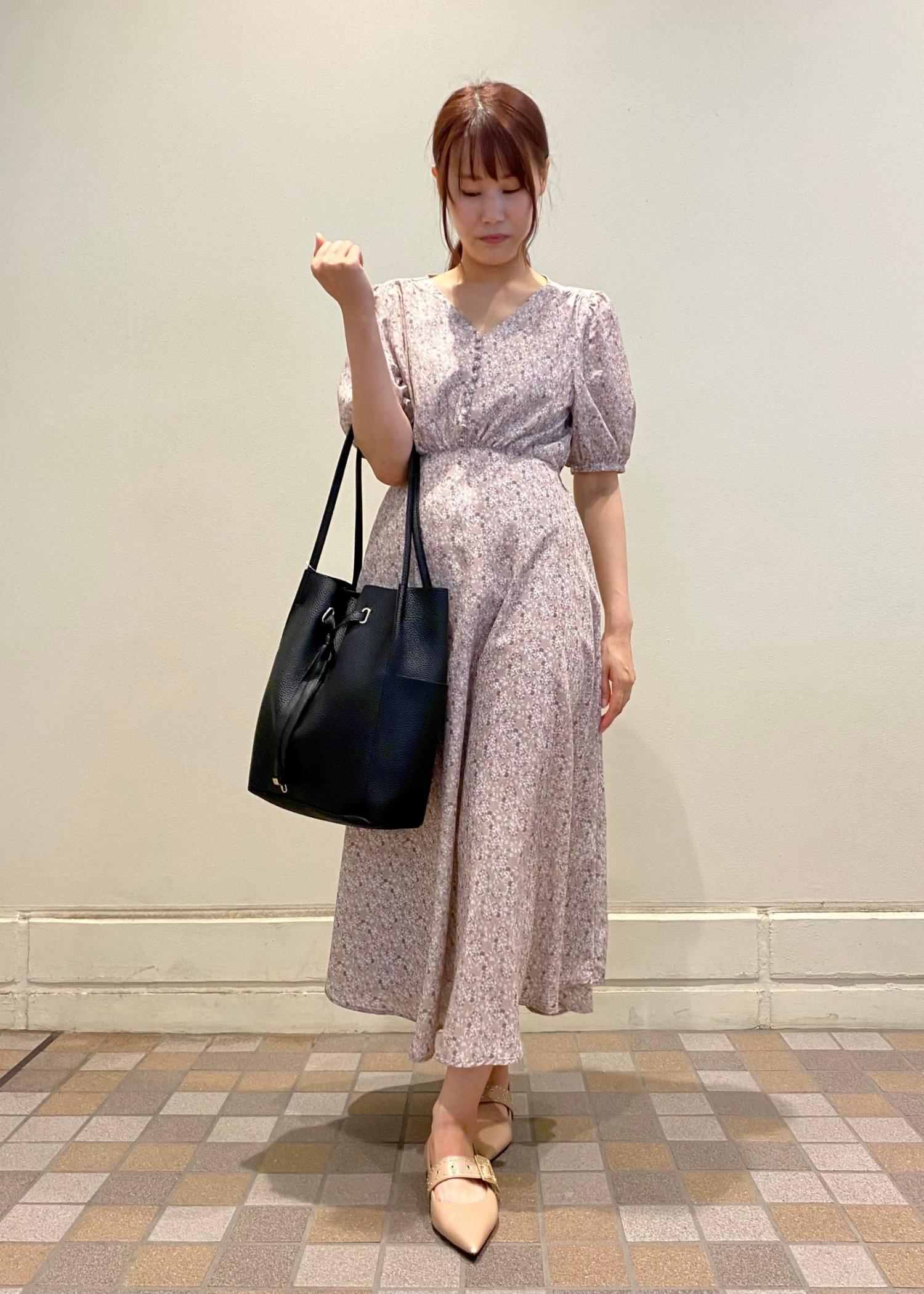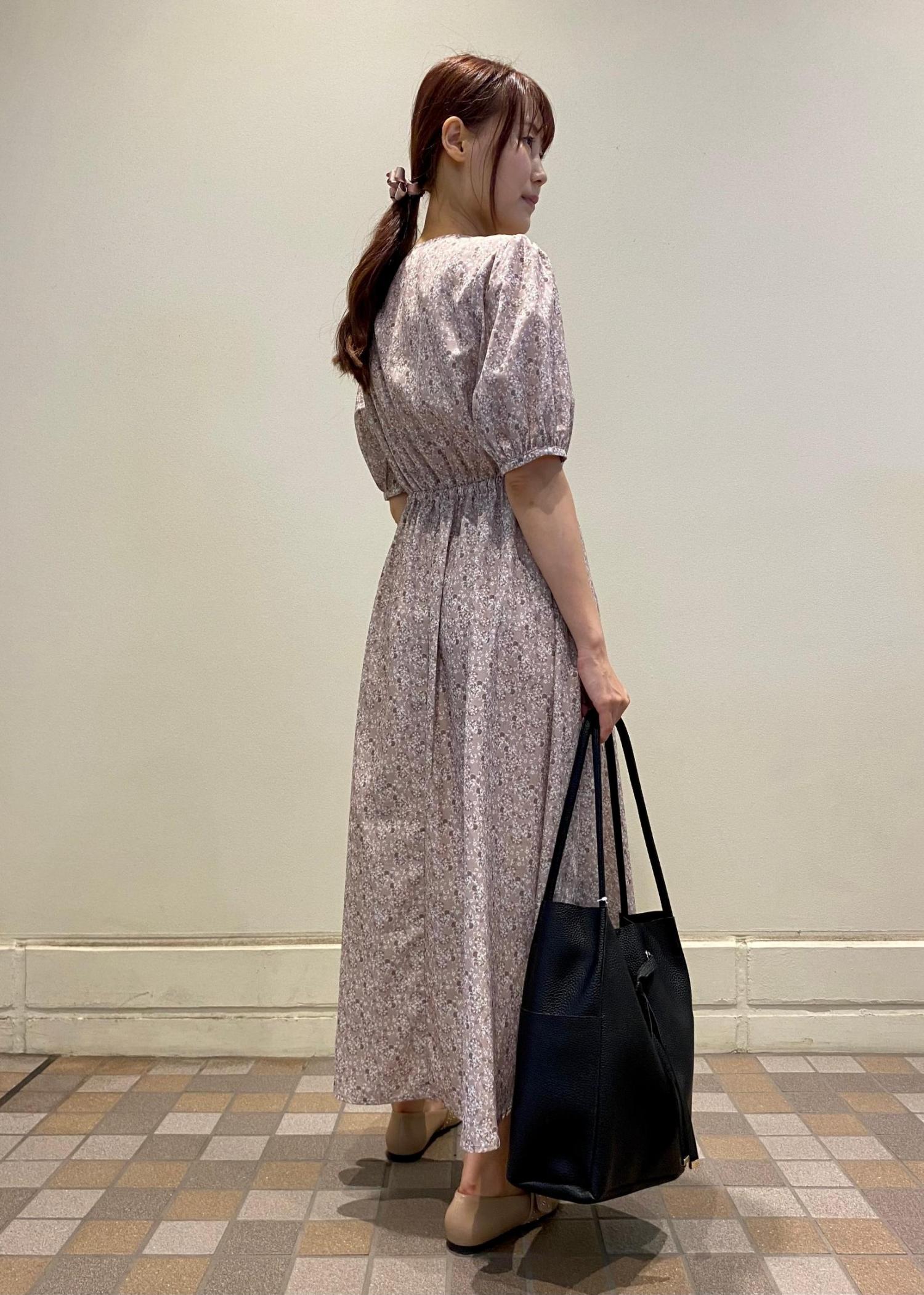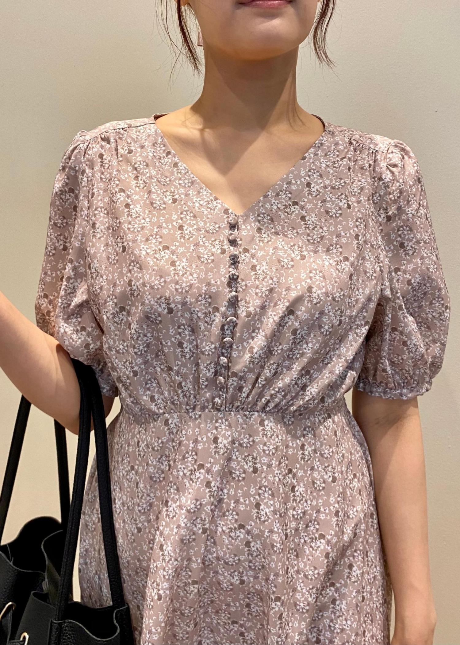 ベージュの小花柄が上品なワンピースです。 1枚で華やかになるのでお仕事はもちろん お出かけでも着ていただけます。 ハイウエスなのでウエストがすきっりと 見えるので脚長効果があります! 季節の変わり目はブーツやカーディガンを 羽織る事で秋まで着れます。