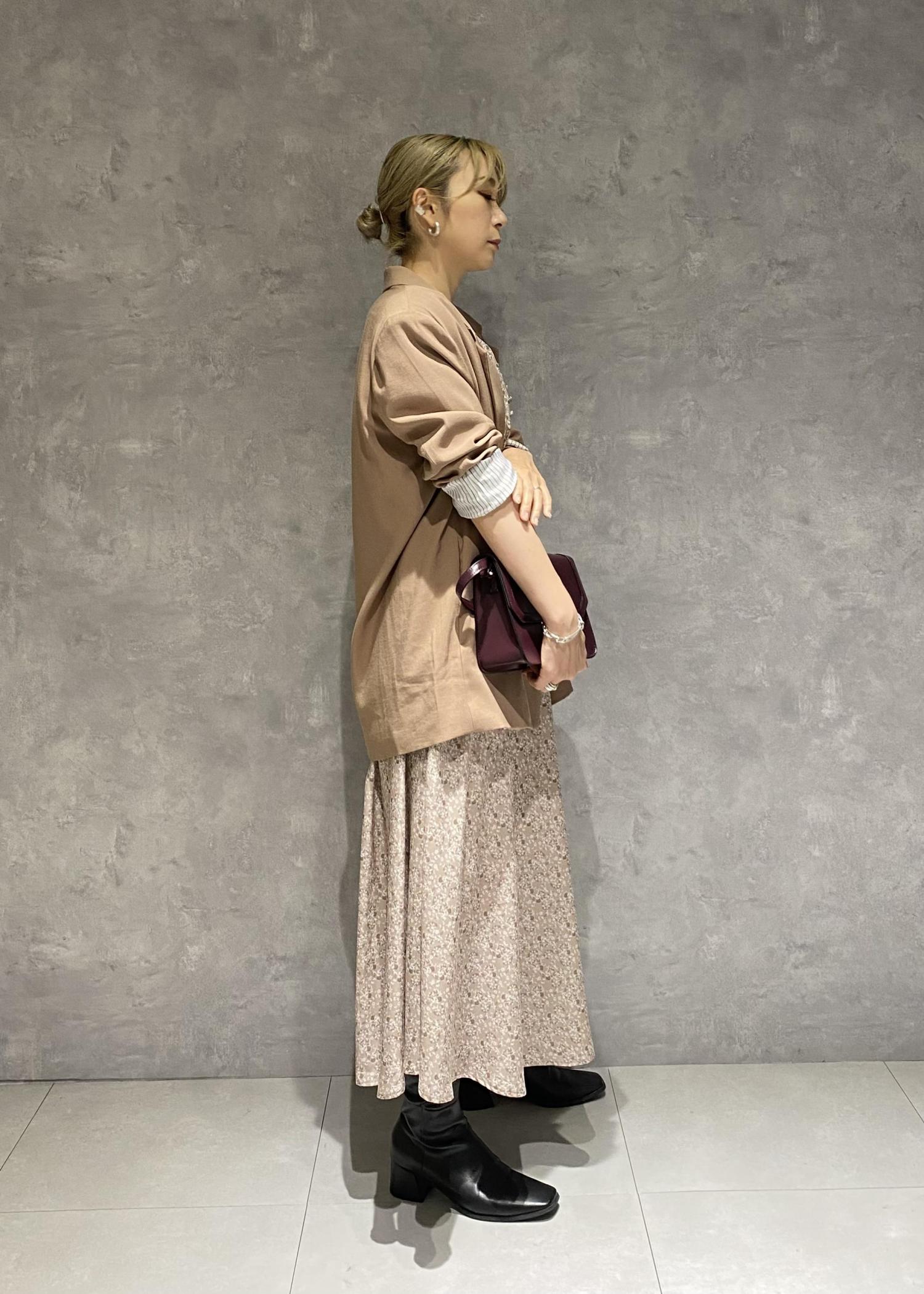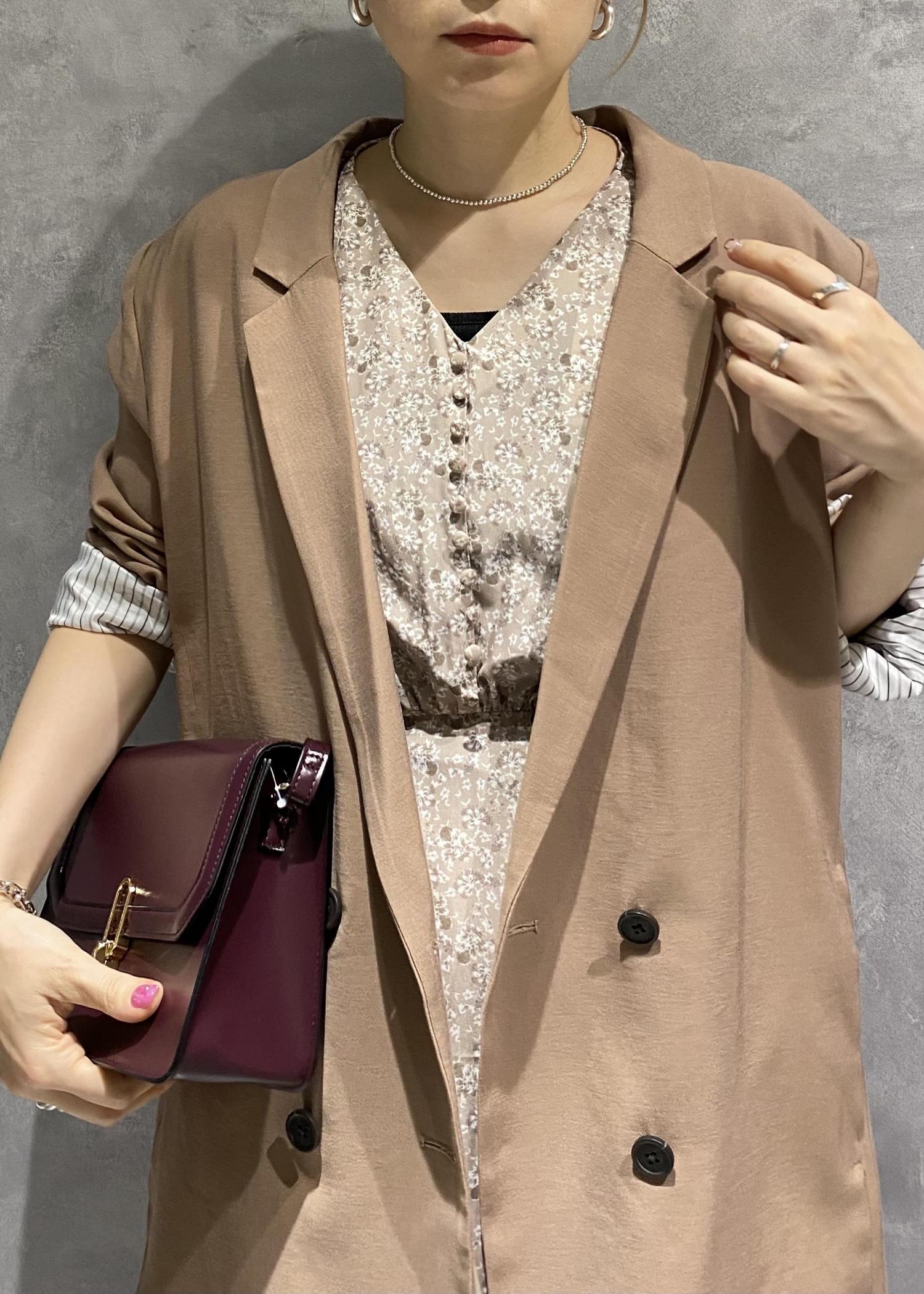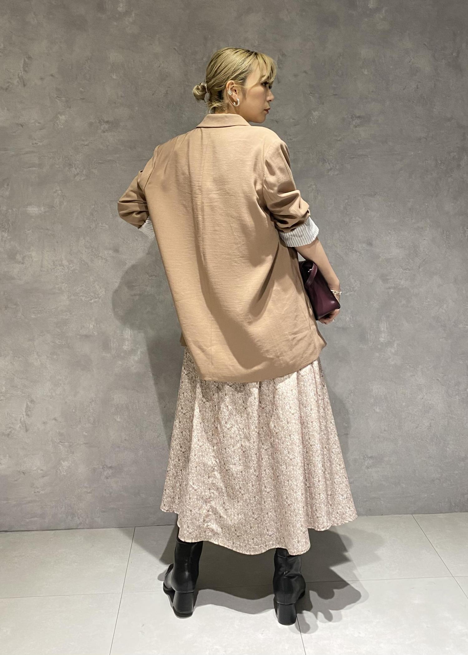 全体的に柔らかいトーンだけどジャケットのオーバーサイズ感でメンズライクなイメージと小花柄が可愛らしいワンピースの甘辛MIXコーデです!