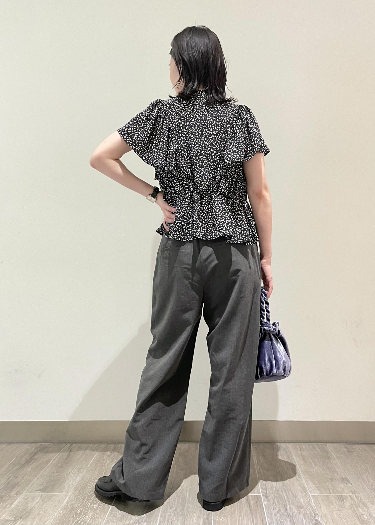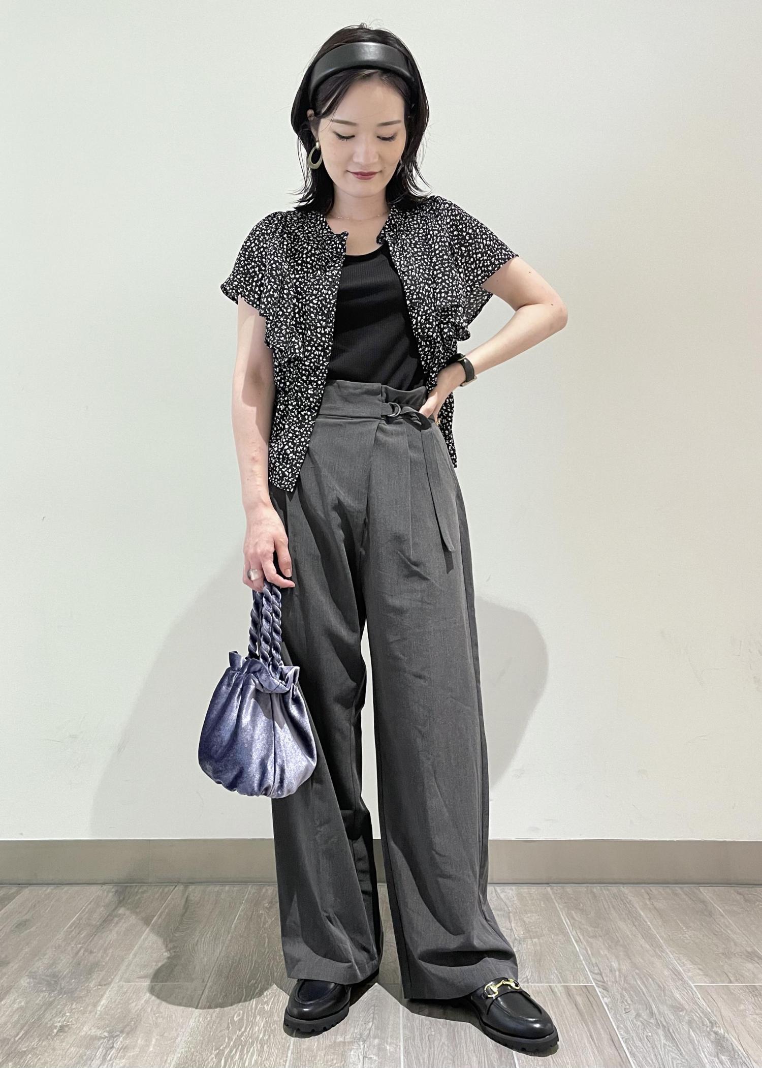 フリルブラウスとカチューシャで女性らしさを出しつつ、全体をブラックでまとめたパンツスタイルでクールに仕上げました。
