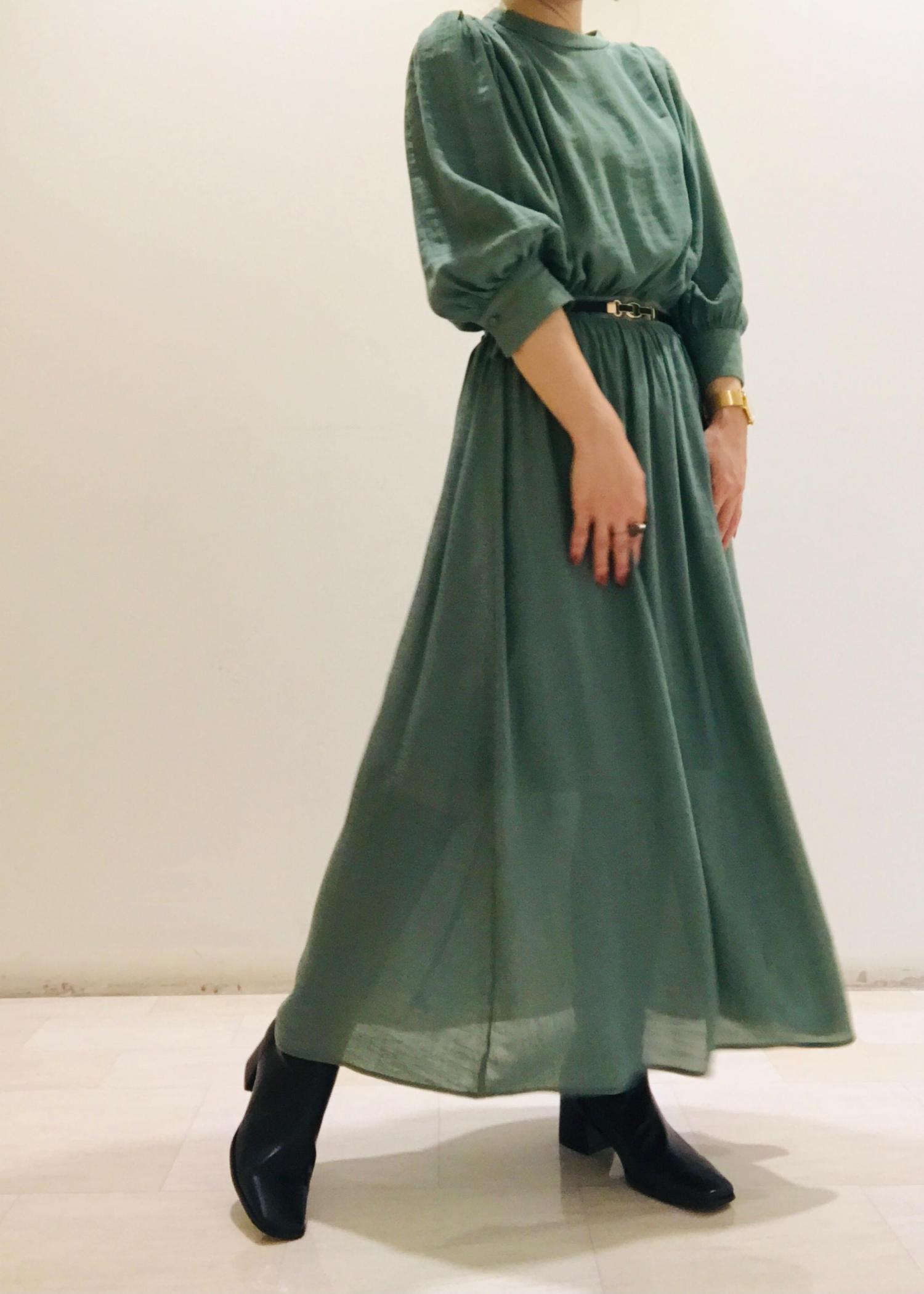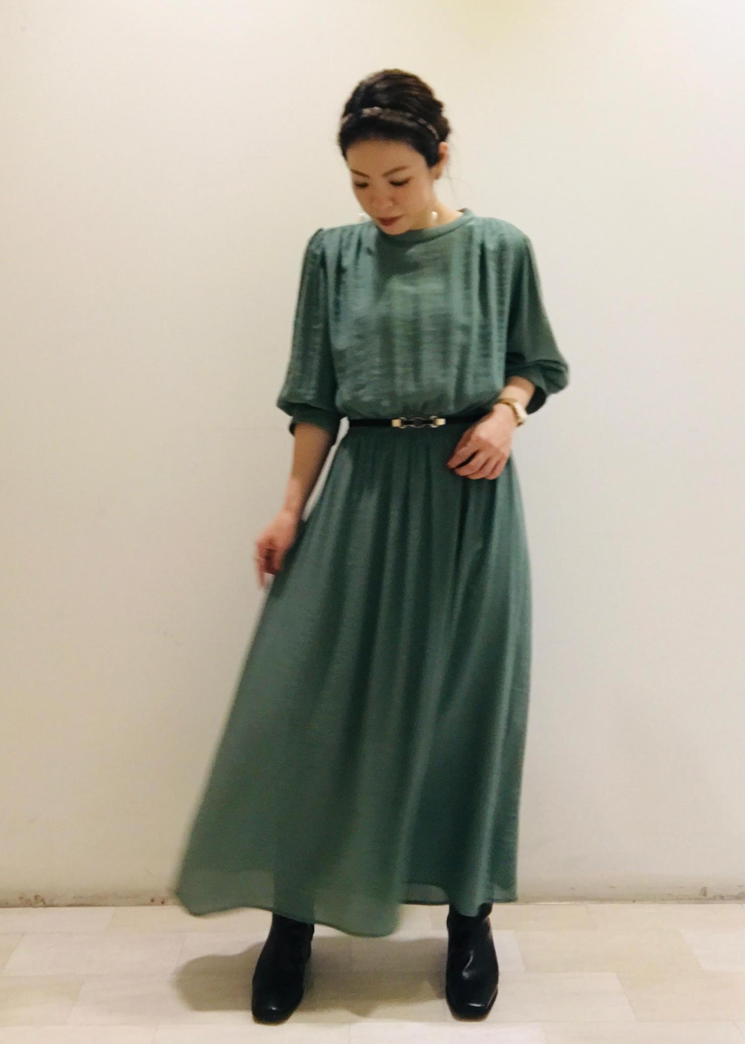 柔らかい生地感のワンピースにあえてロングブーツを合わせた、先取りコーデにしてみました!