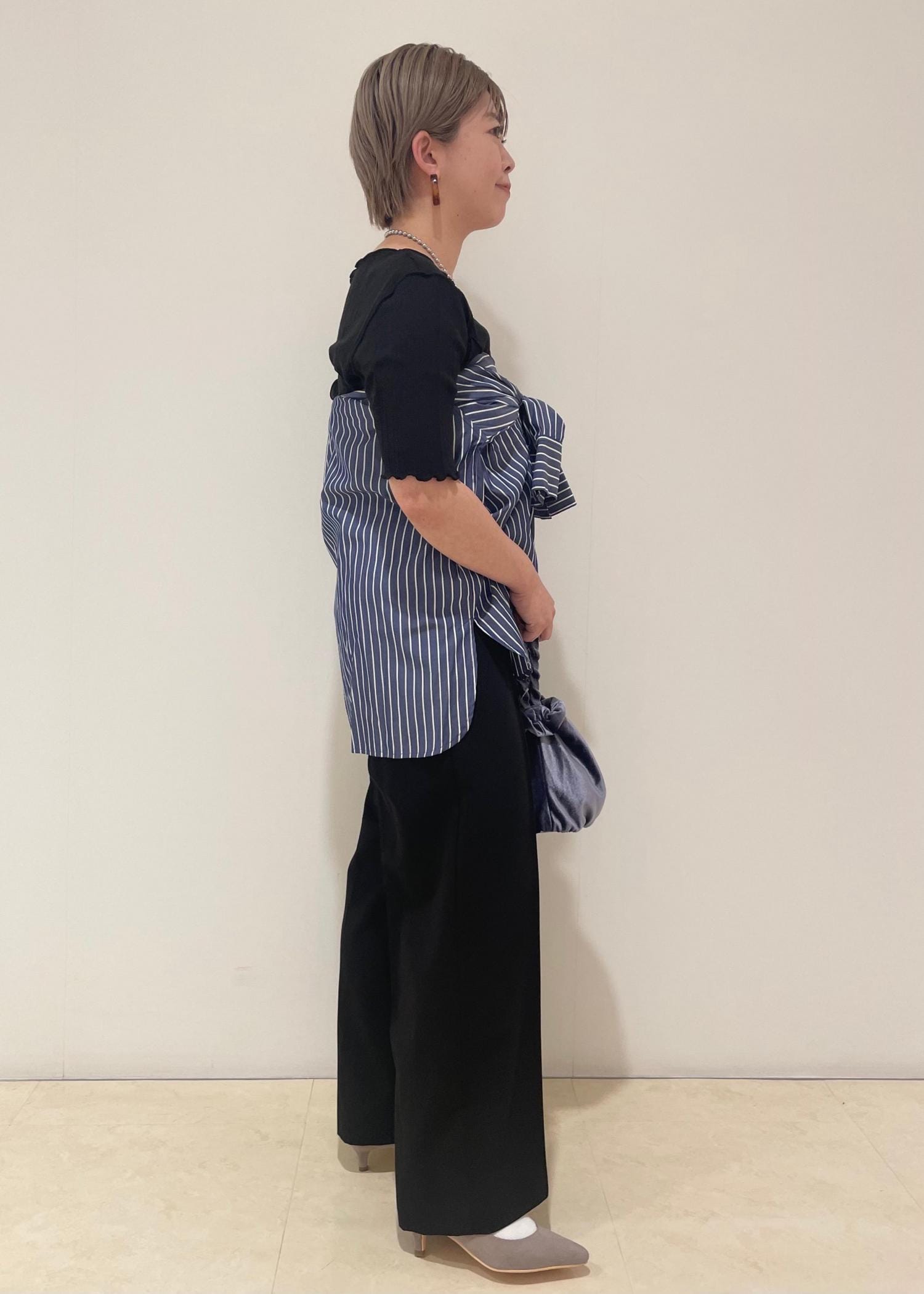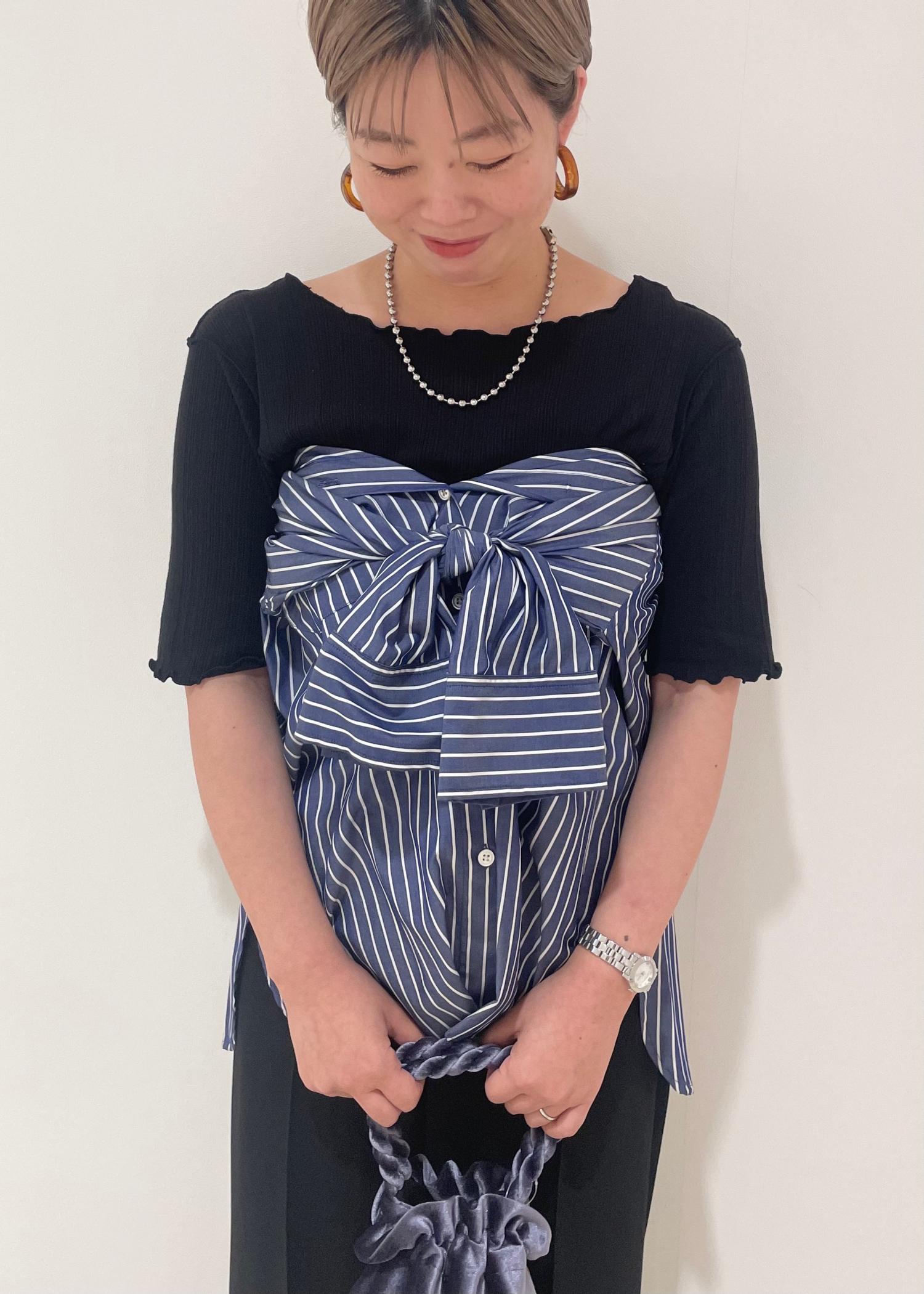 定番のストライプシャツは、そのまま着たり、羽織ったり、巻いたり、、、など万能アイテムですが、今回は袖を胸元で結んでビスチェ風にアレンジ⭐︎