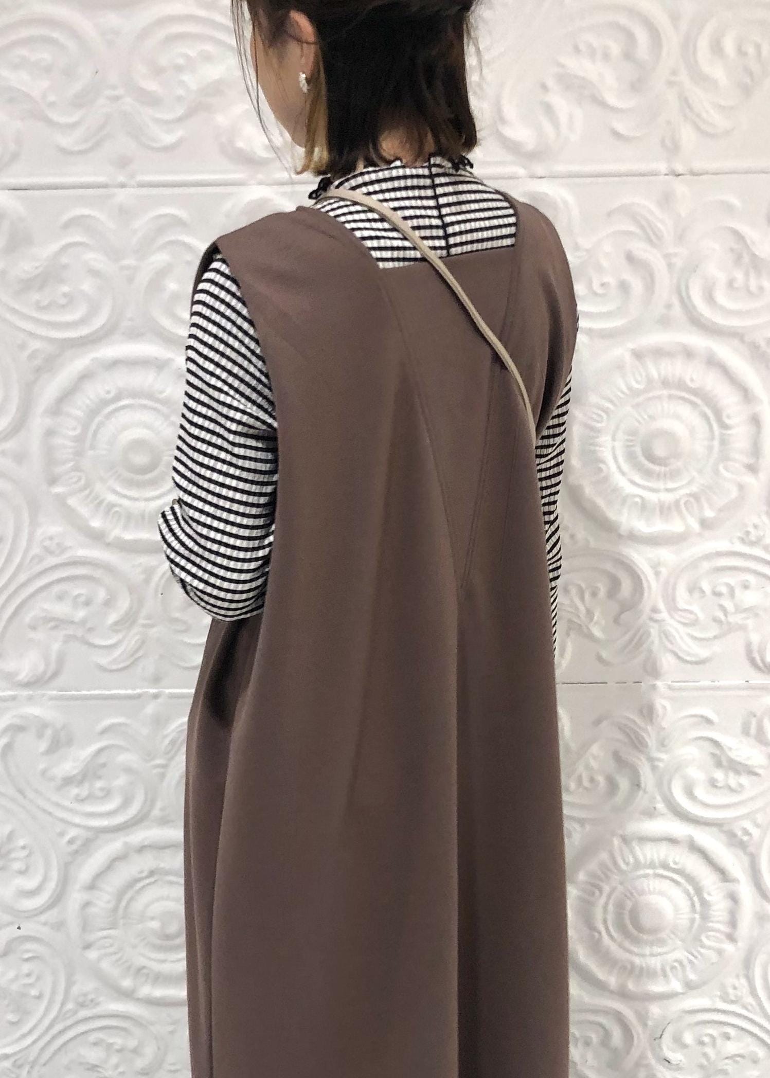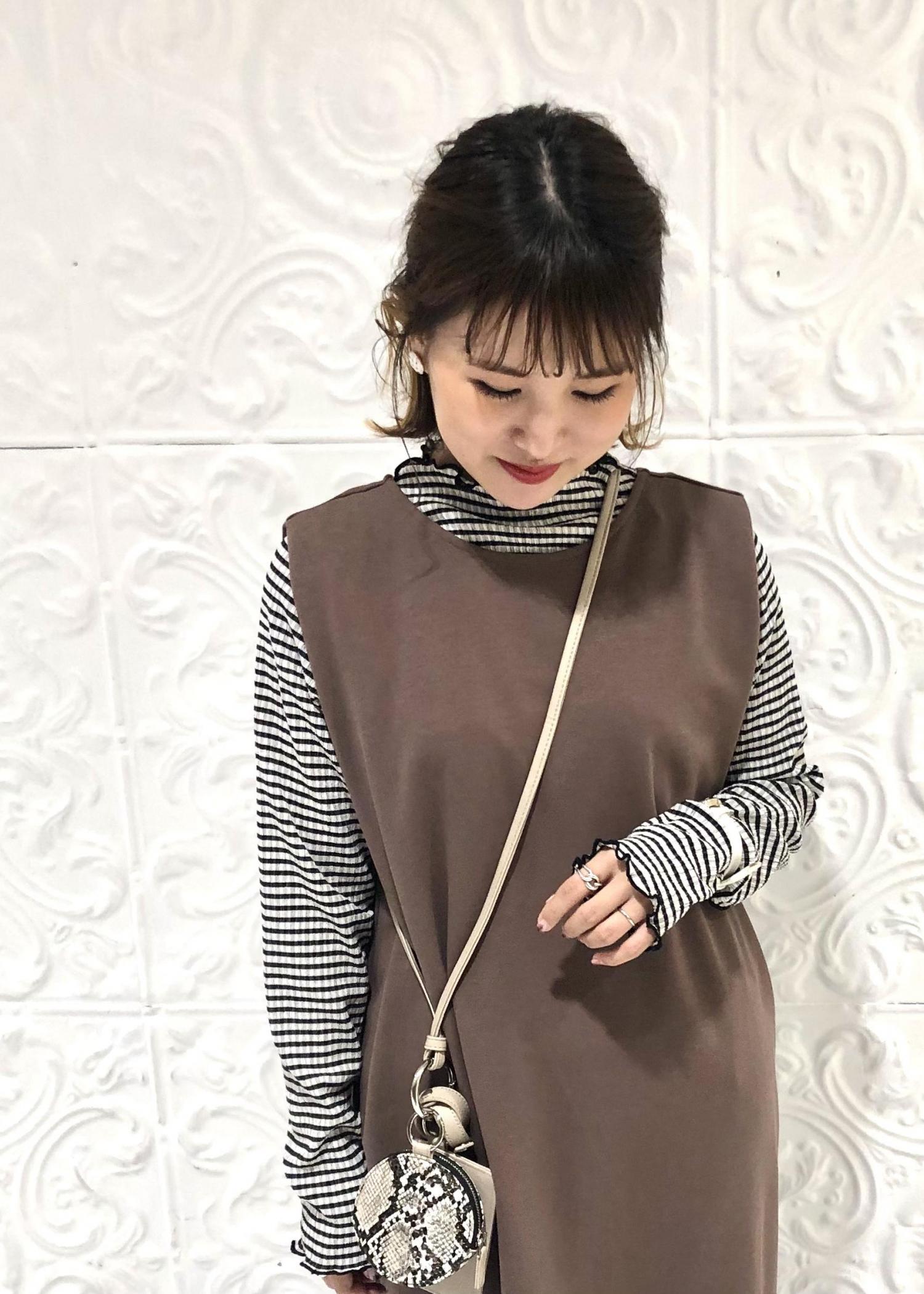 凹凸感のあるインナーで違う素材感のアイテムをレイヤードすると、お洒落に見えます。