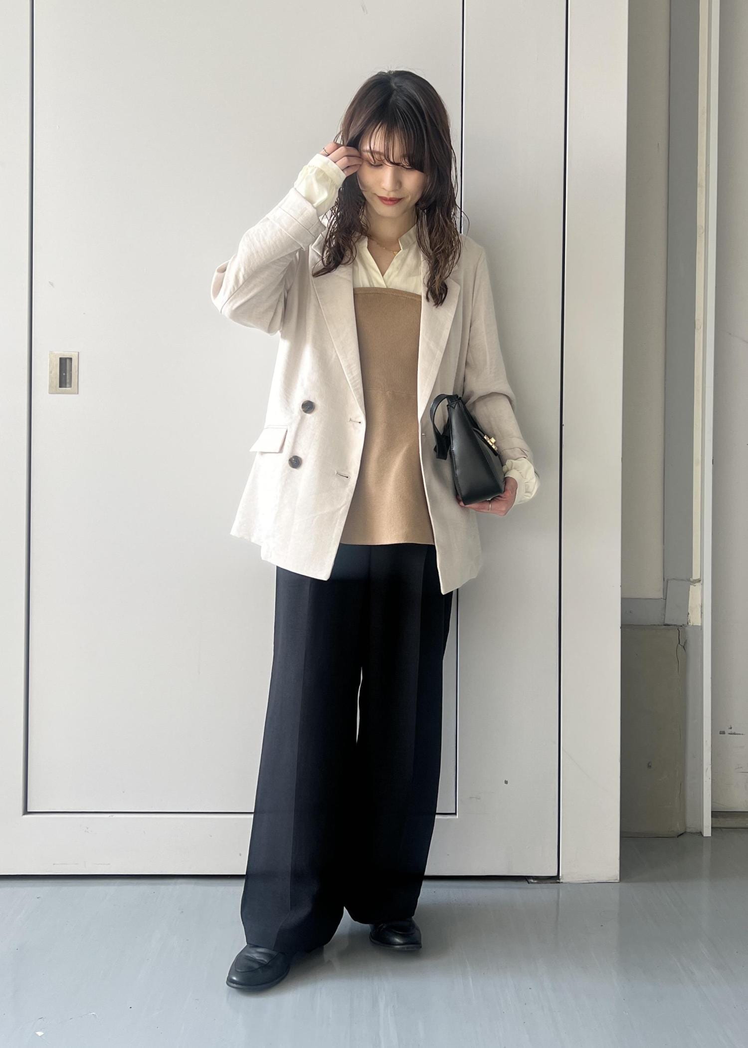 セットアップ対応のスカートでコーディネートしてみました。少し落ち着いたカラーと素材感が大人なセットアップを演出してくれます。