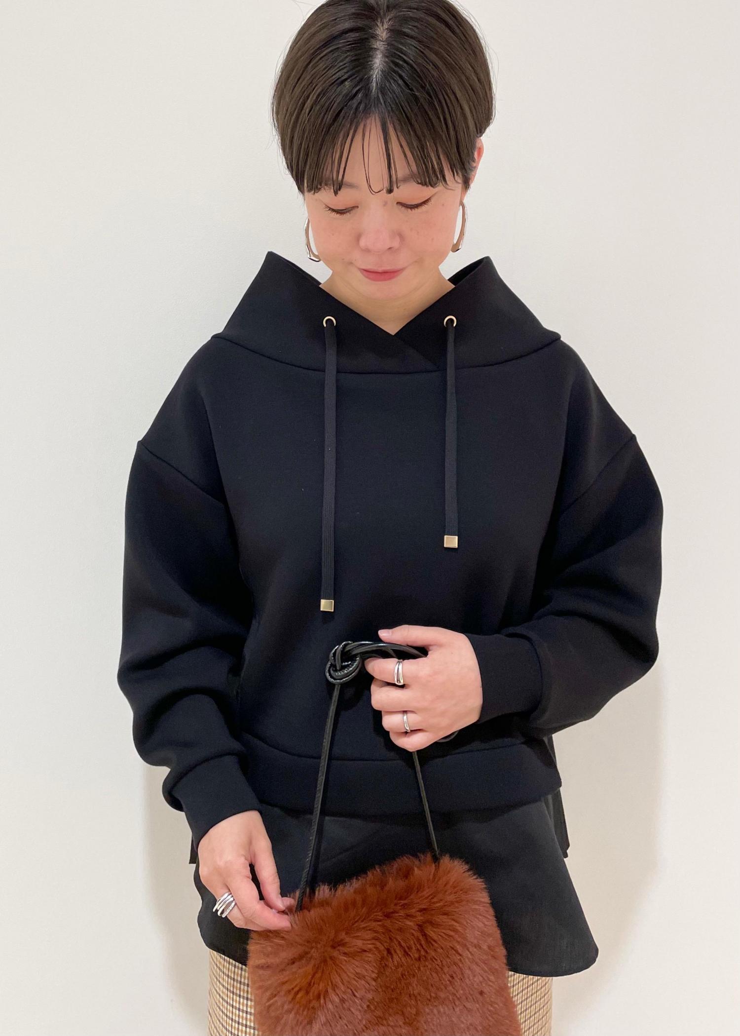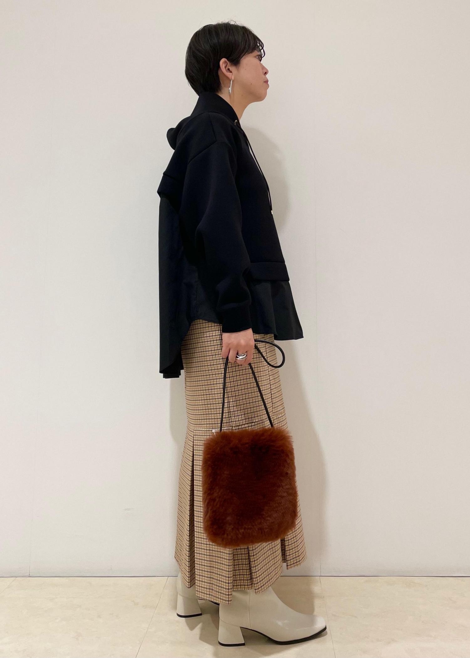 マーメイドラインのチェックスカートに、デザイントップスを合わせ、ラフさはありつつも女性らしいスタイリングにしました☺︎