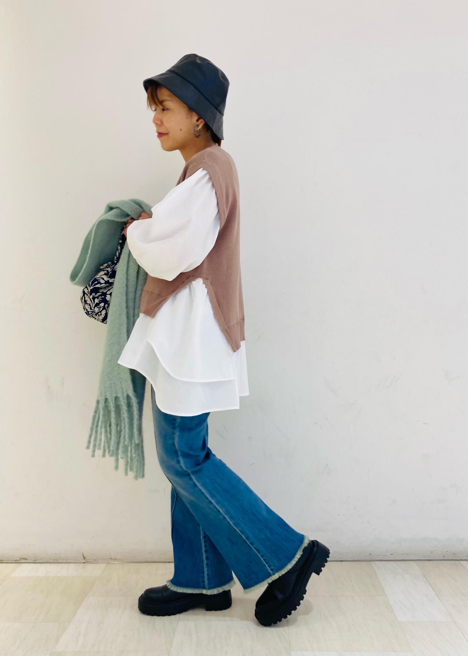 少し甘めのトップスはデニムやボリュームソールブーツでカジュアルに合わせました。肌寒い日はふわもこストールを羽織りとして合わせていただくのもオススメです◎