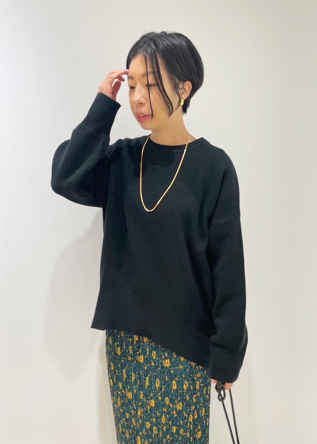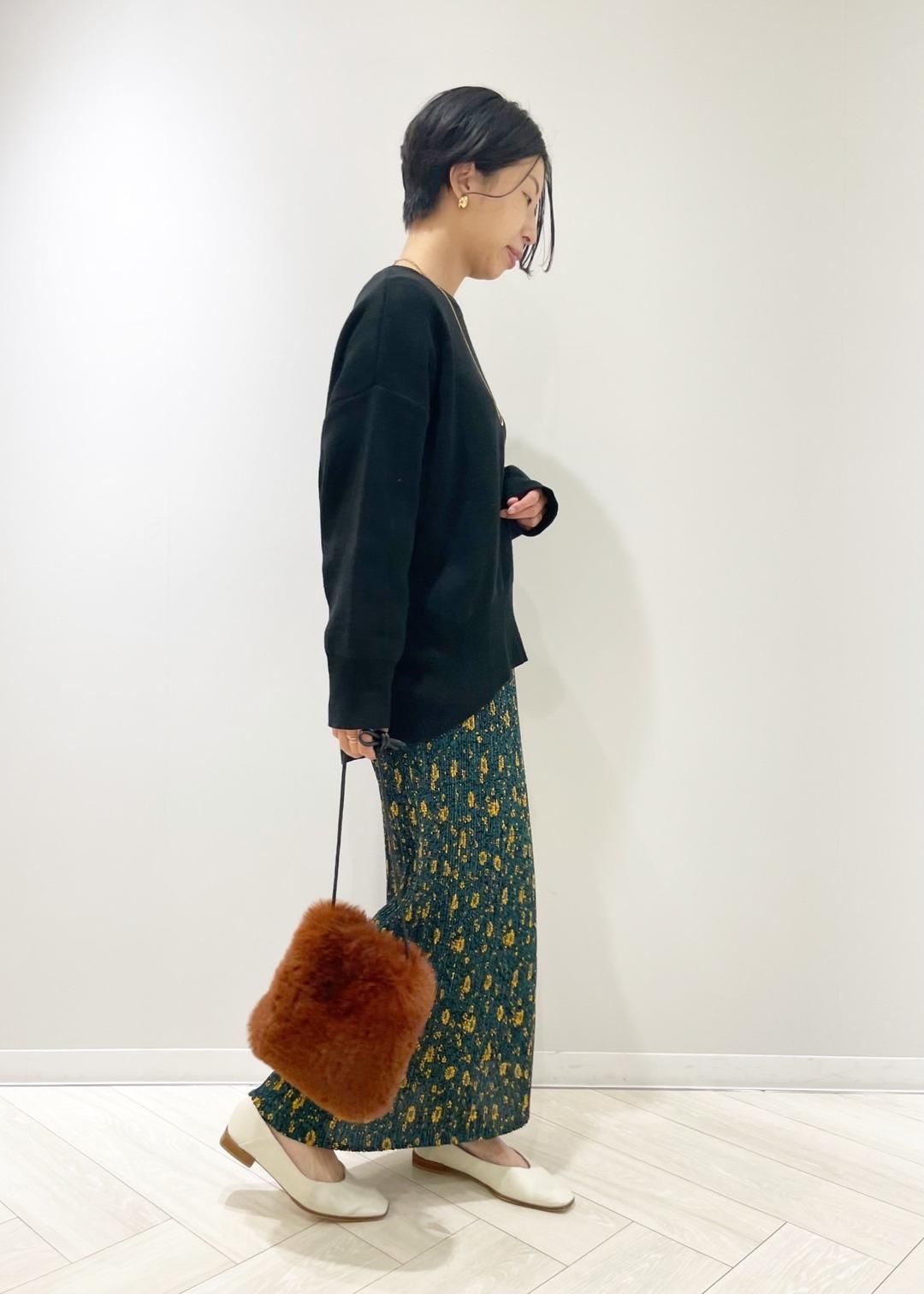 Iラインのプリーツスカートにゆったりしたニットを合わせた大人カジュアルなスタイリングにしました!