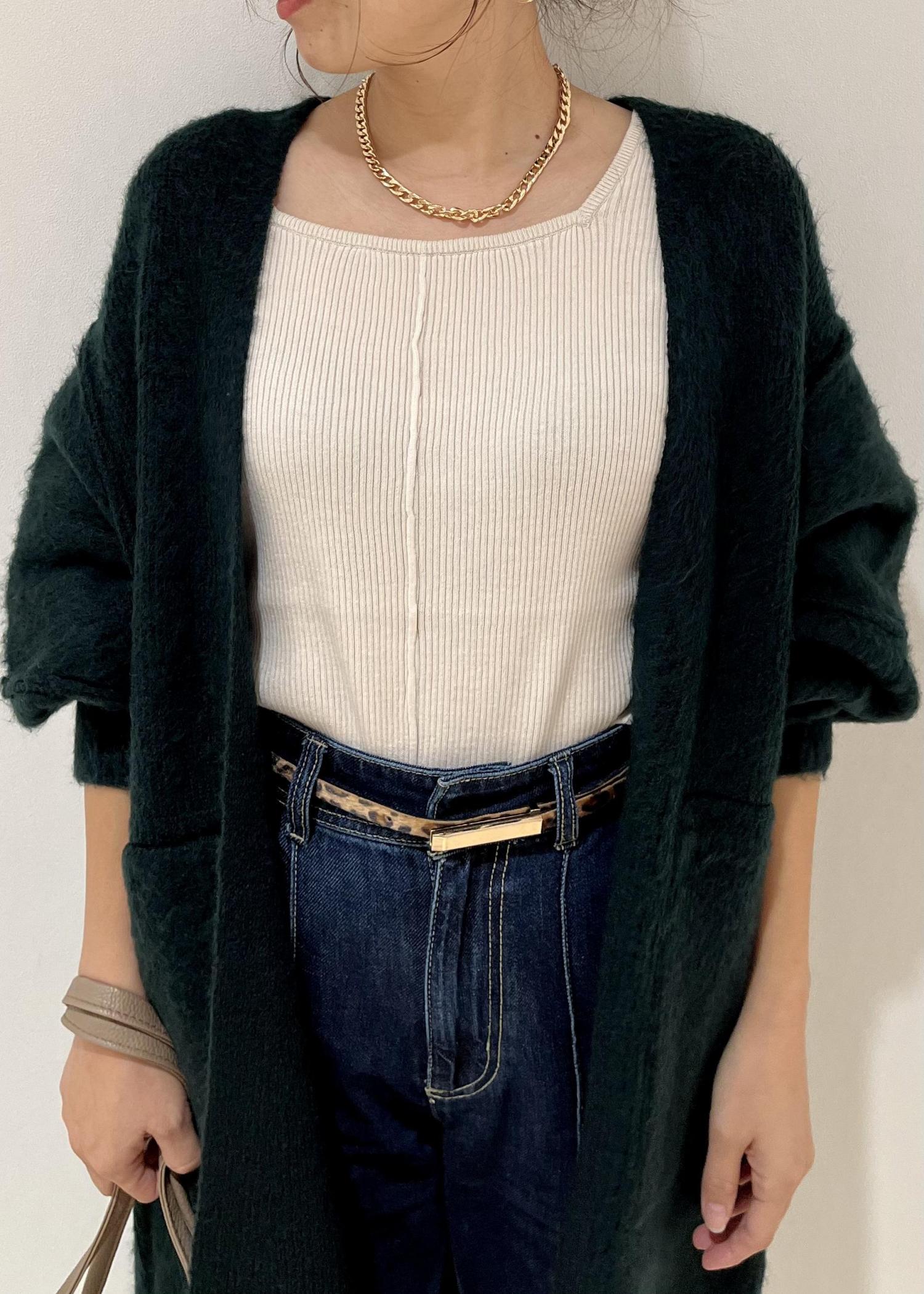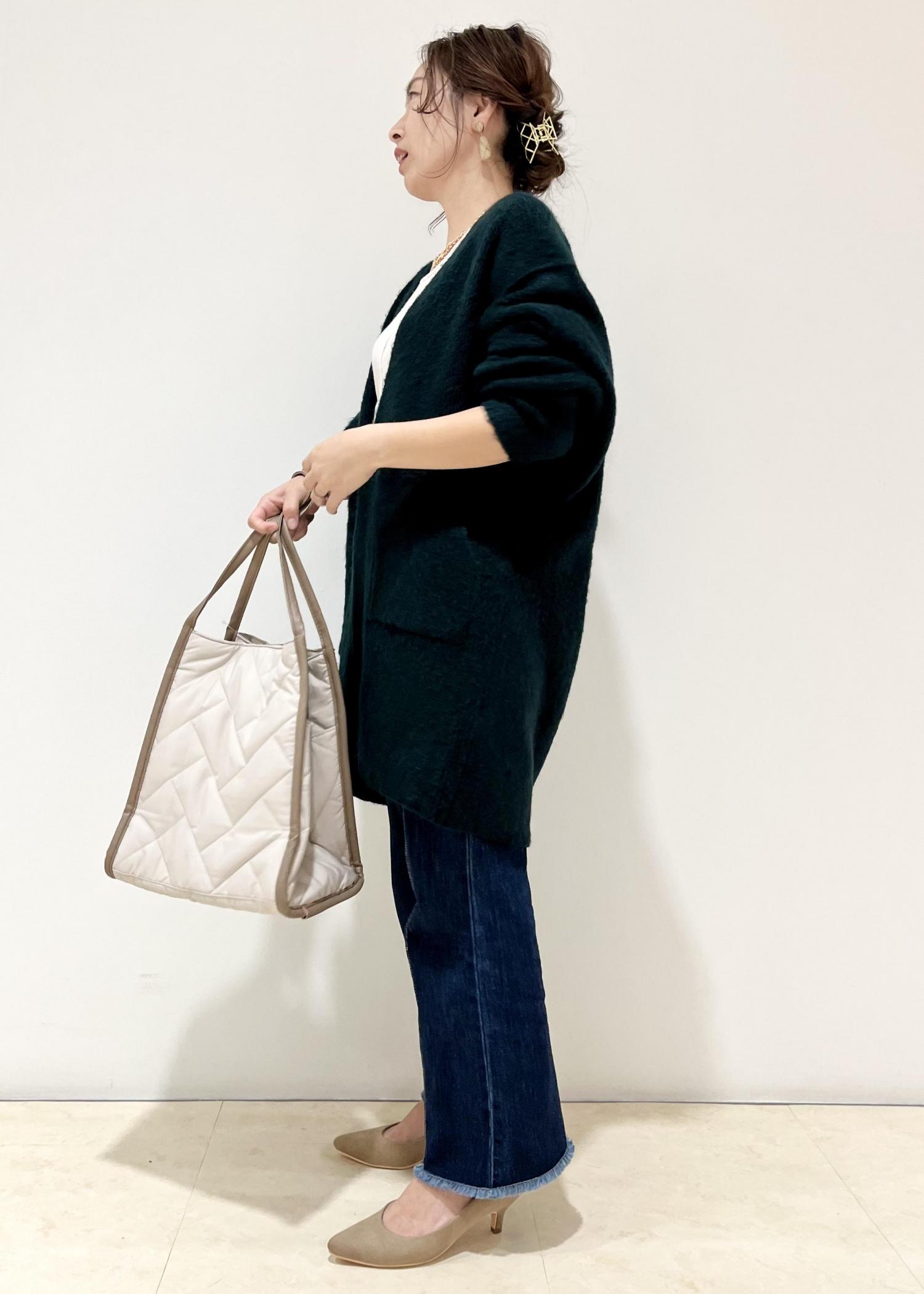 インナーはシンプルニットとデニムで、カーデはグリーン