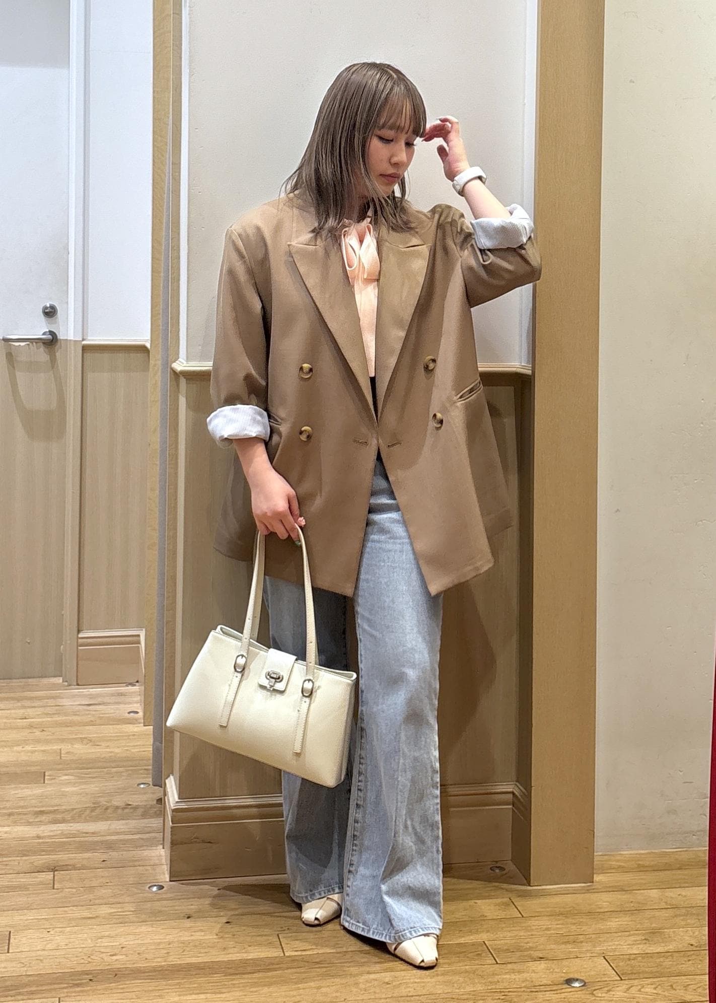 今年トレンドのジャケットはかっちりし過ぎないように、デニムを合わせてこなれ感あるコーデにしました。