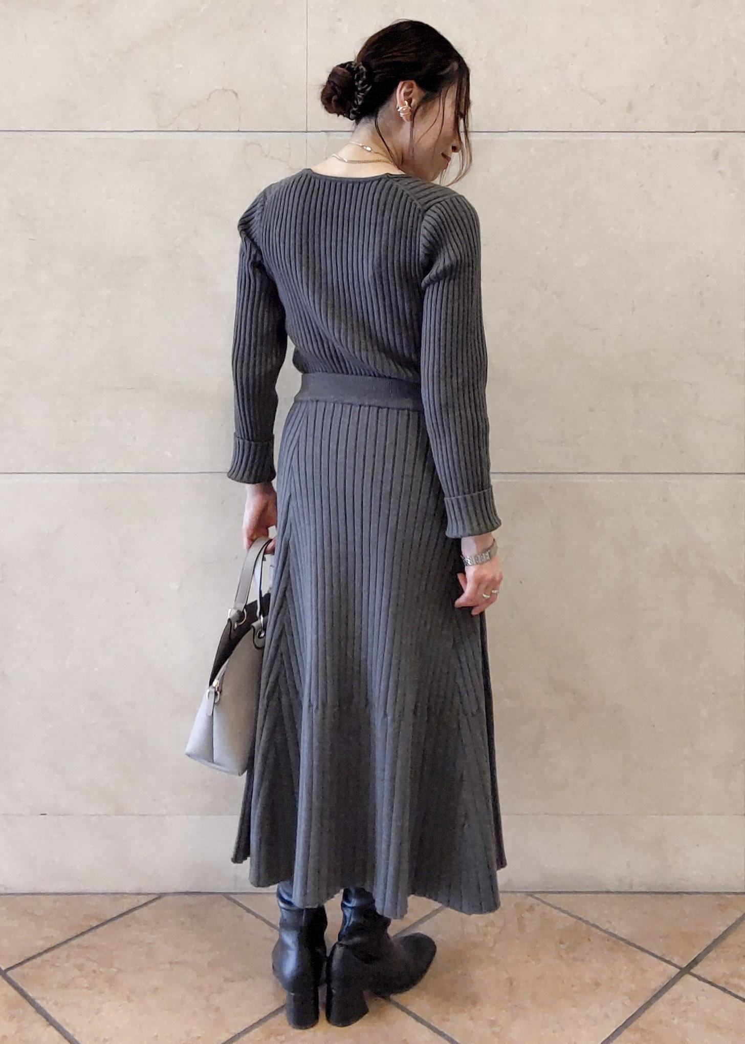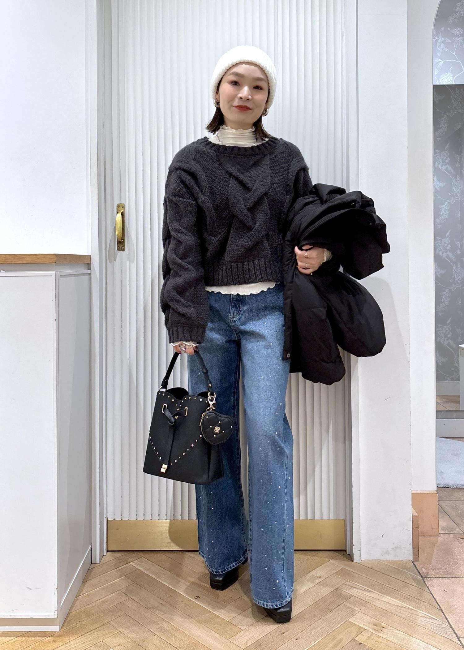 バッグやブーツは落ち着いた印象のワントーンで色を揃えていますが、デコルテが開いているので女性らしい華やかさがあり、シンプルになり過ぎず着こなしていただけると思います。
