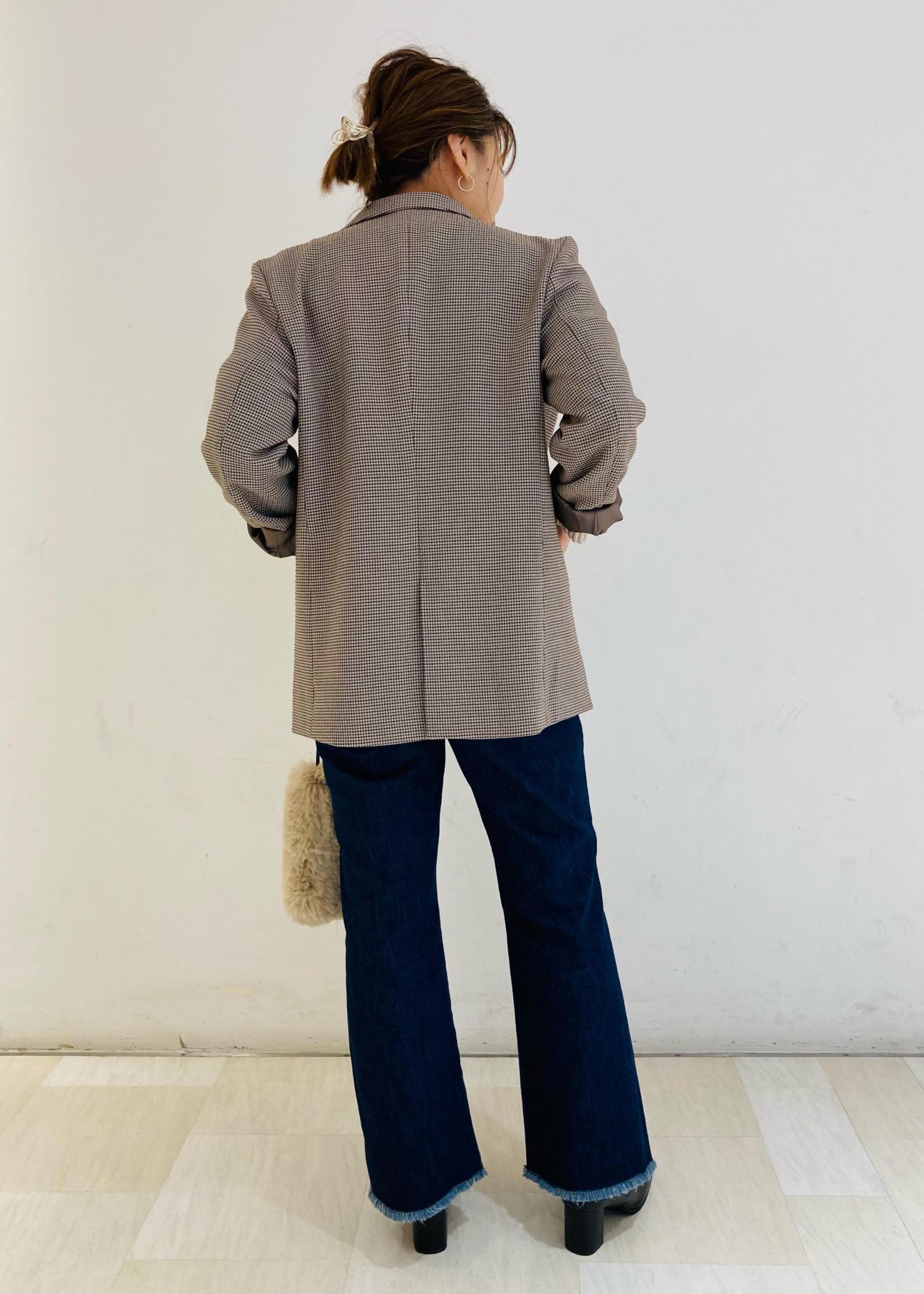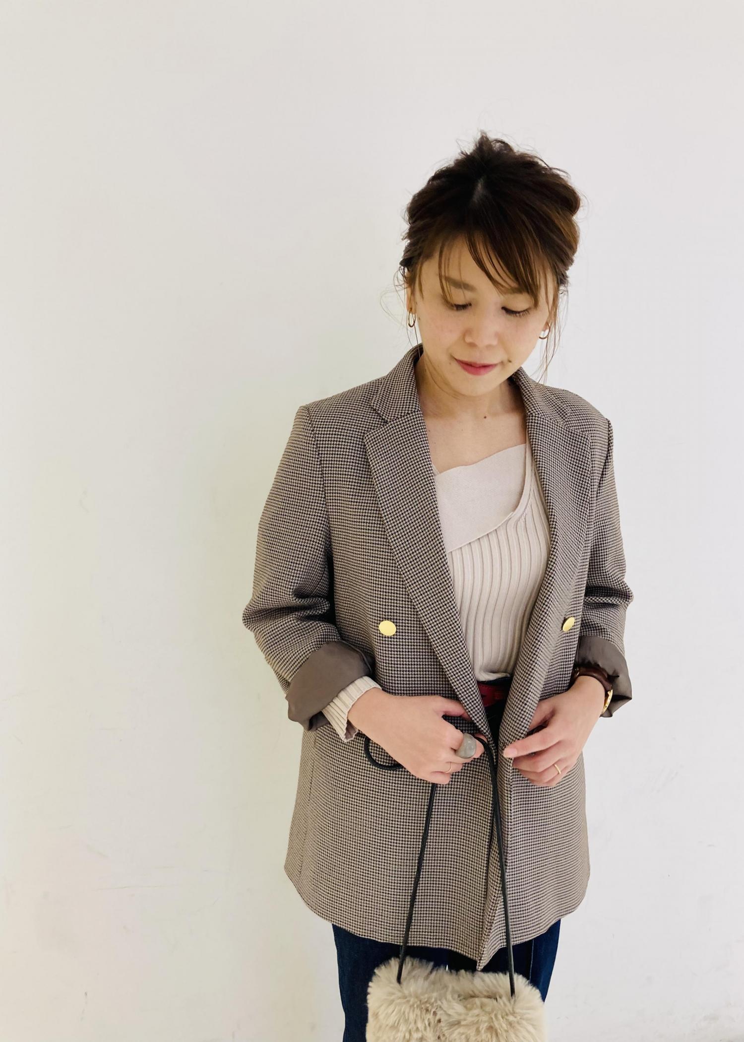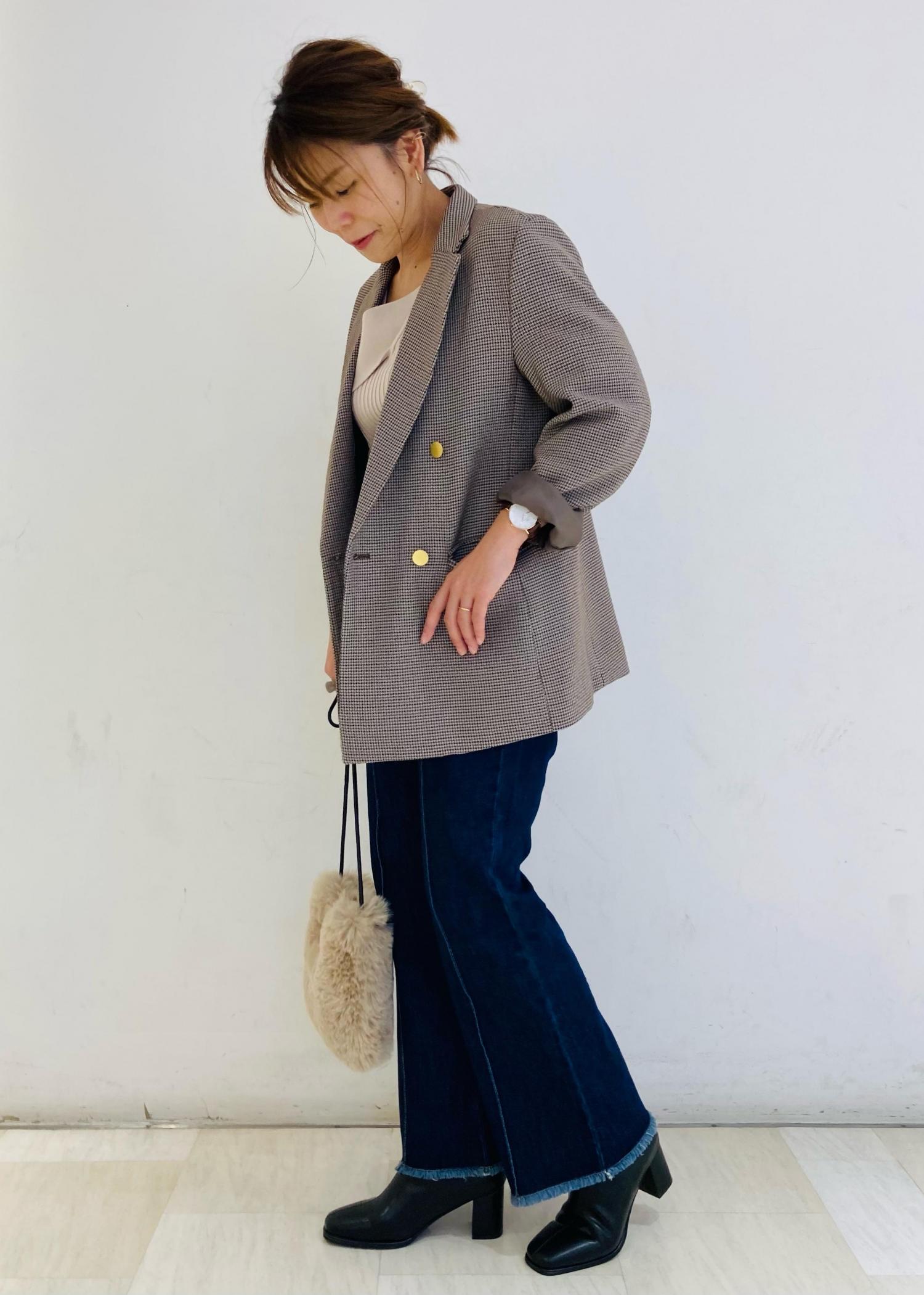 金ボタンジャケットや星さんコラボアイテムのリブニットプルオーバーで女性らしさを取り入れたスタイリングはカジュアルになる様にフレアデニムパンツではずしました。