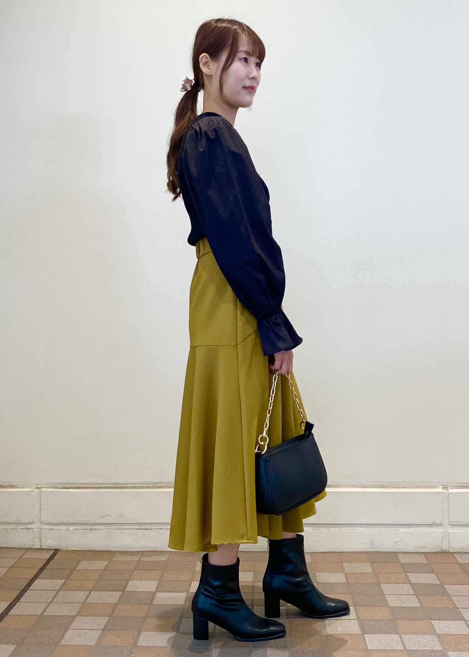 くすみイエローは秋らしいカラーです。 マーメイドにふんわり広がるスカート がとても可愛いです。 トップスは黒を合わせて落ち着いた 雰囲気のコーデにしました。 Instagramも更新中です♡ @VIS_tamatera