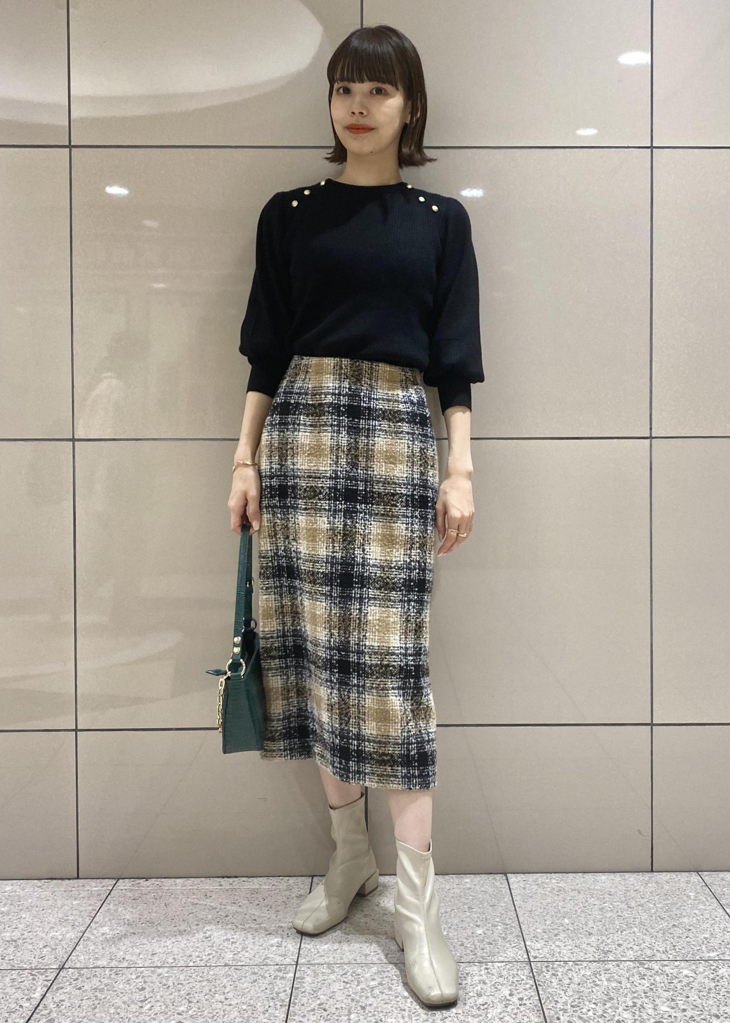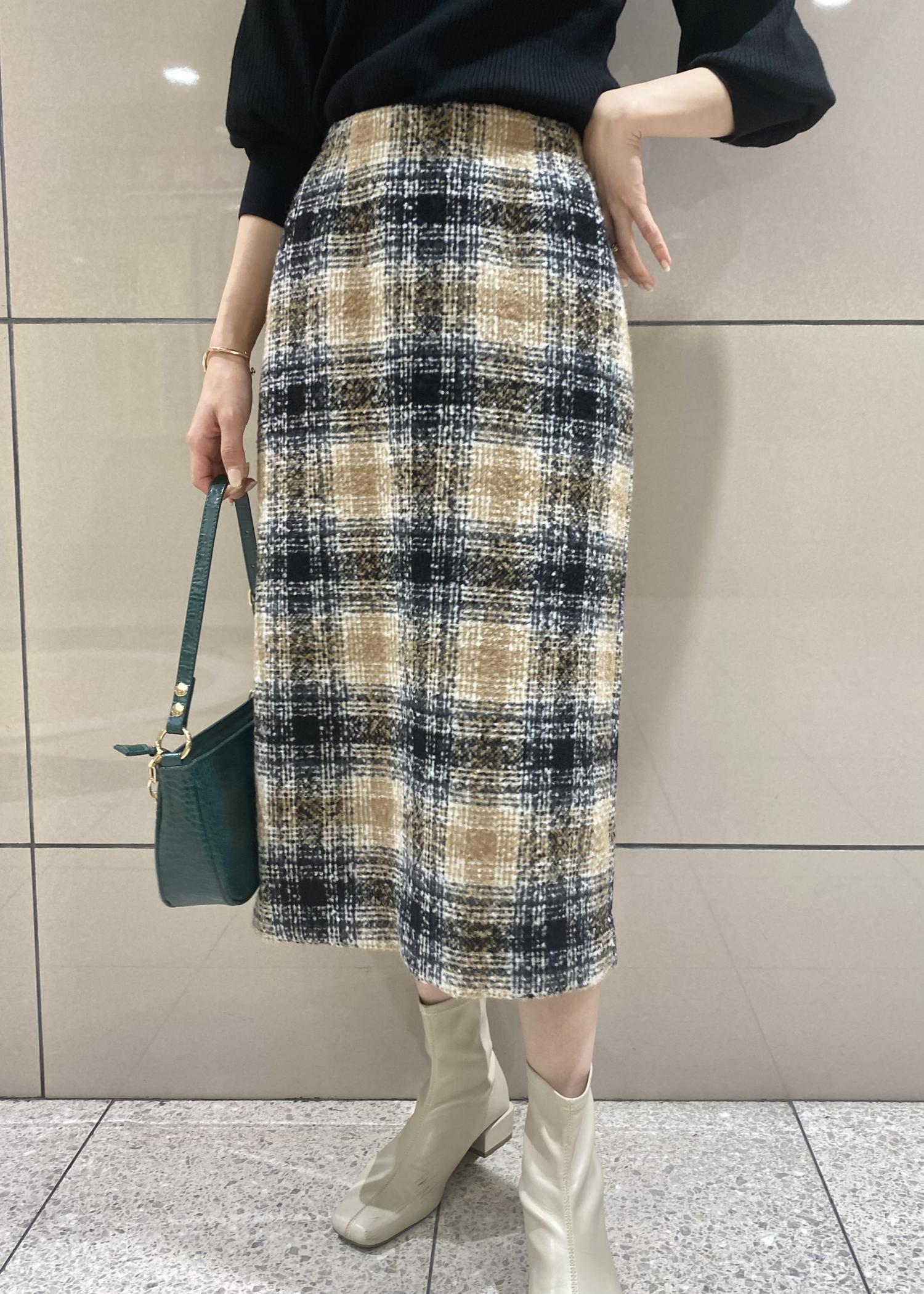 綺麗目なスタイルにしたかったので、中はブラックのハイゲージニットにチェック柄タイトスカートを合わせた王道コーデにしました☺︎