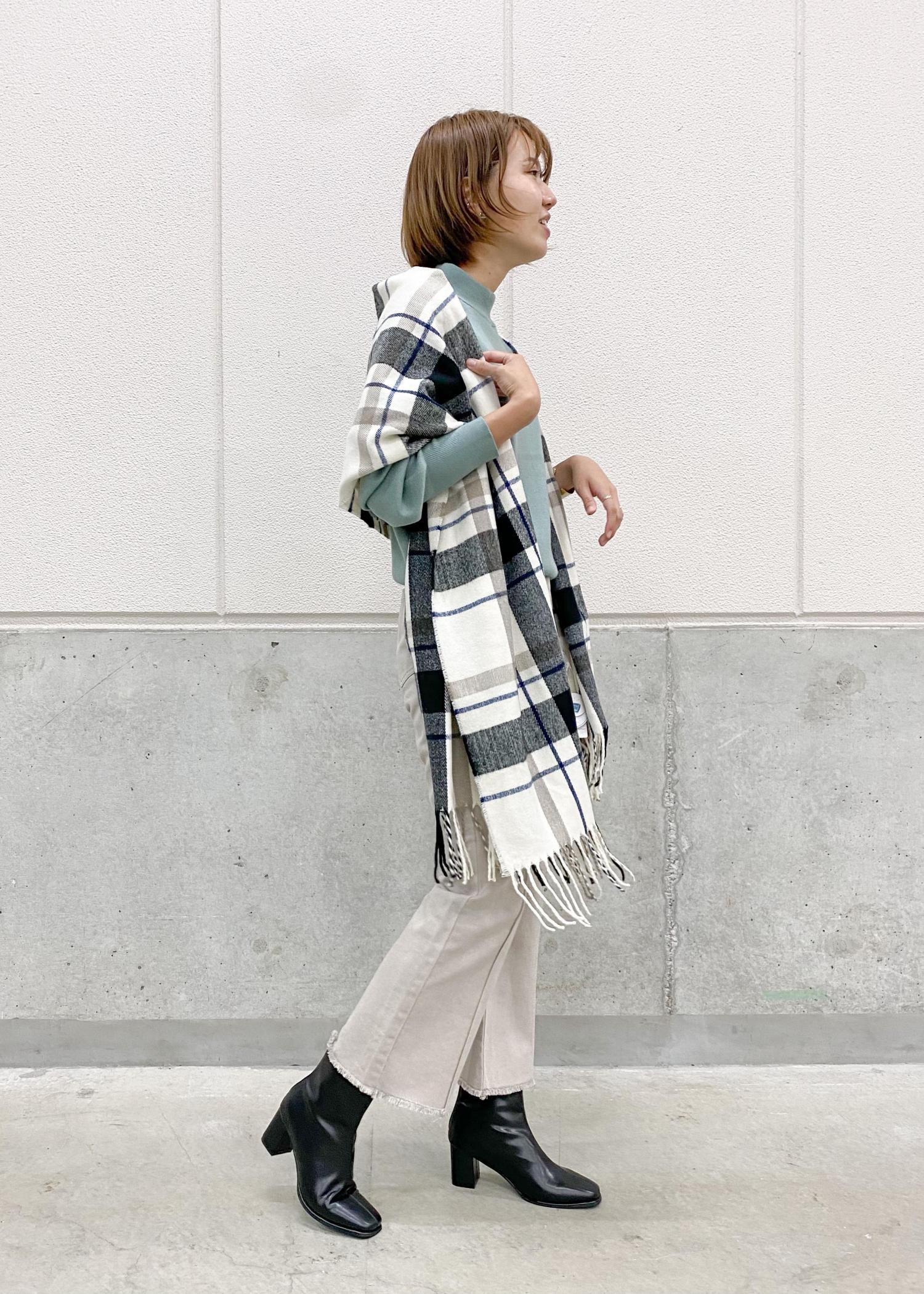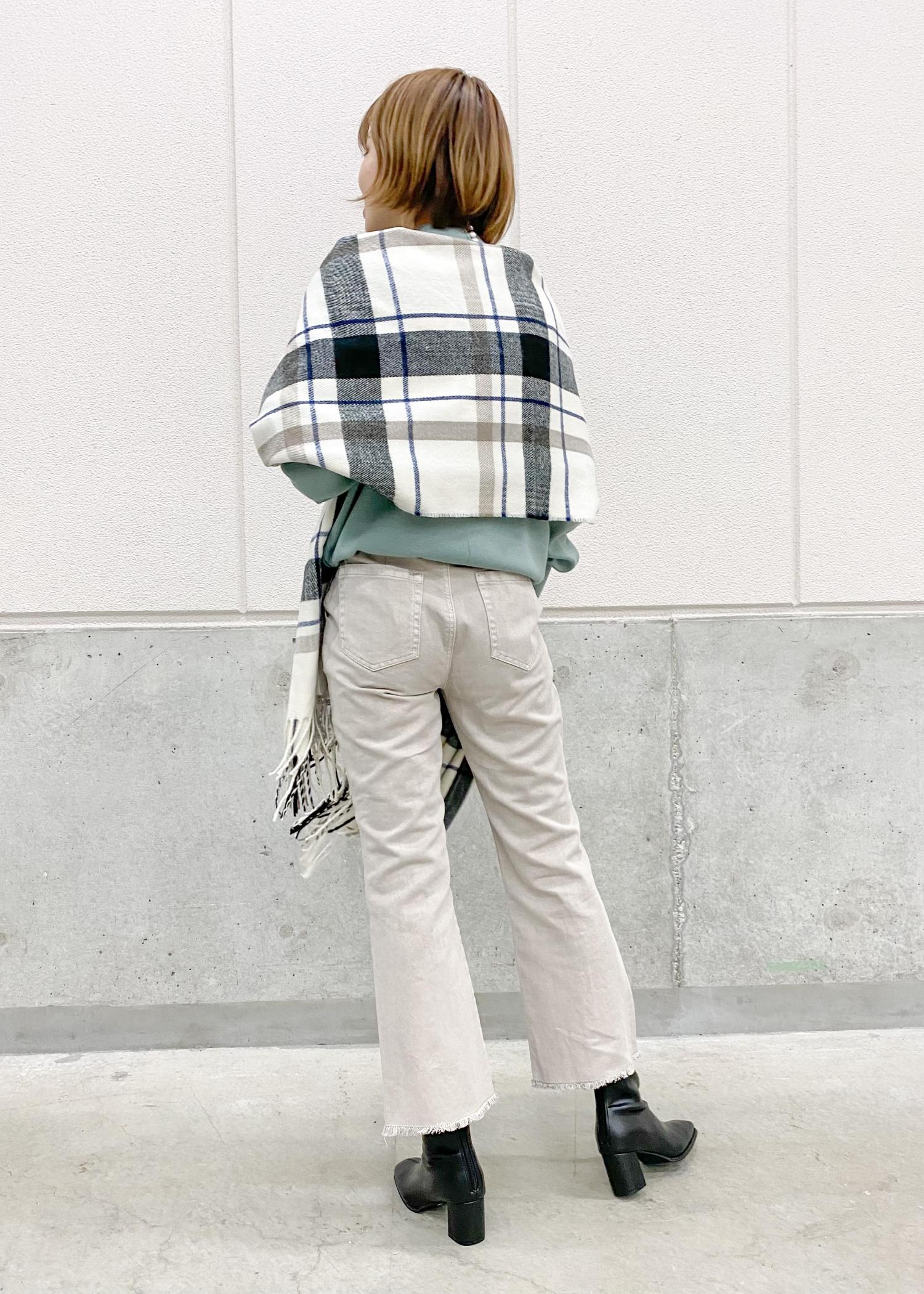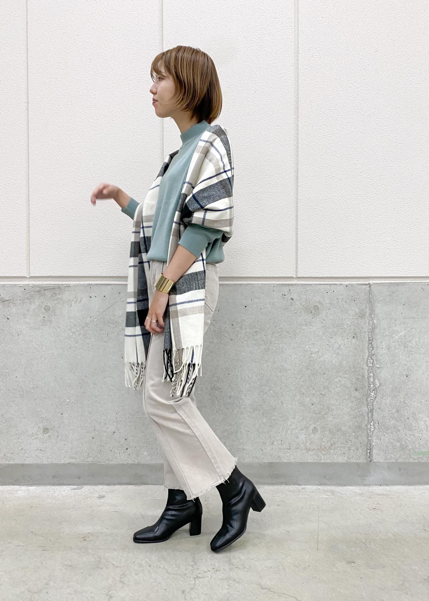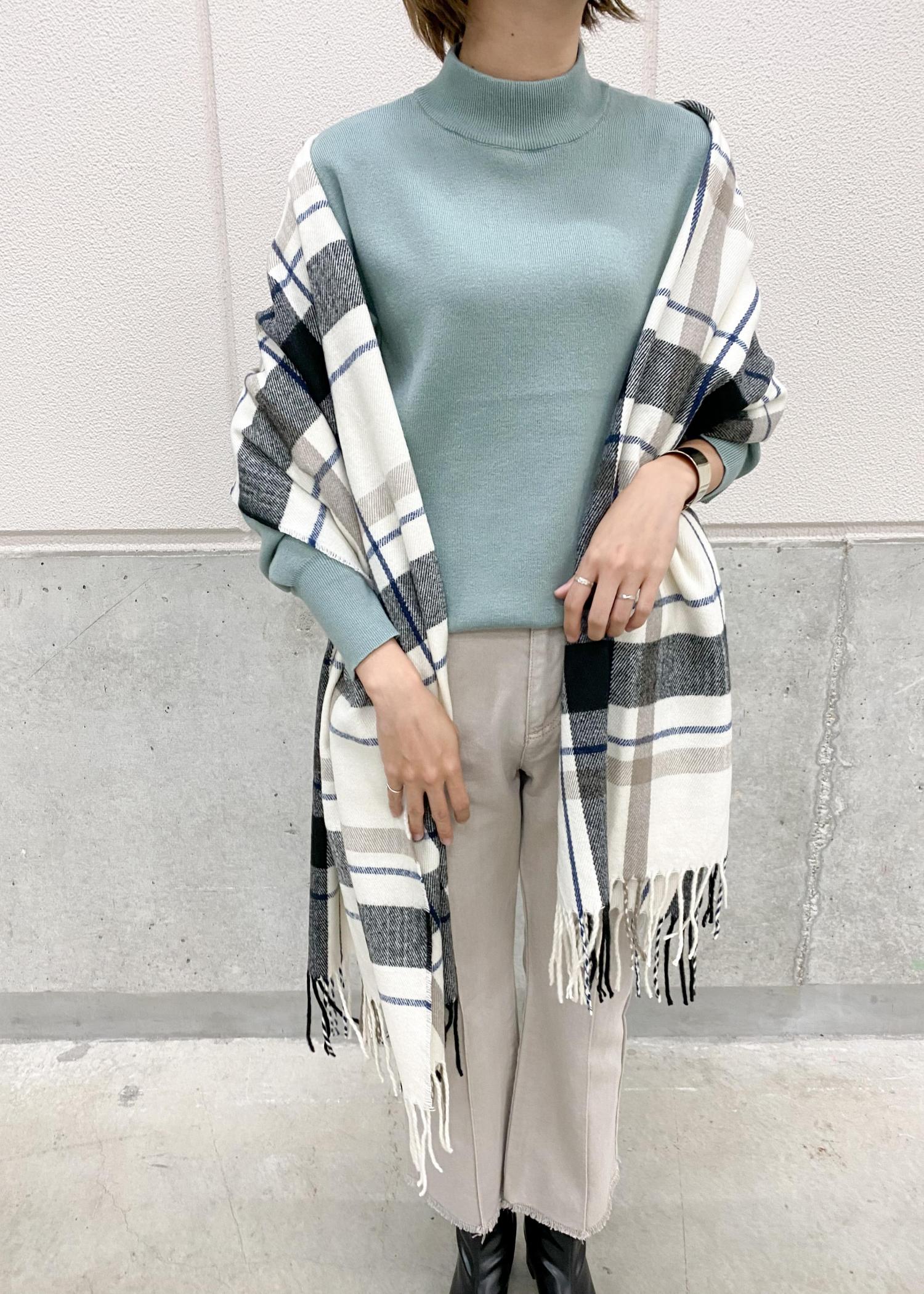 このニットならダスティーカラーで落ち着いた印象になるので、普段カラーを着ない方にもチャレンジして頂きやすいです!