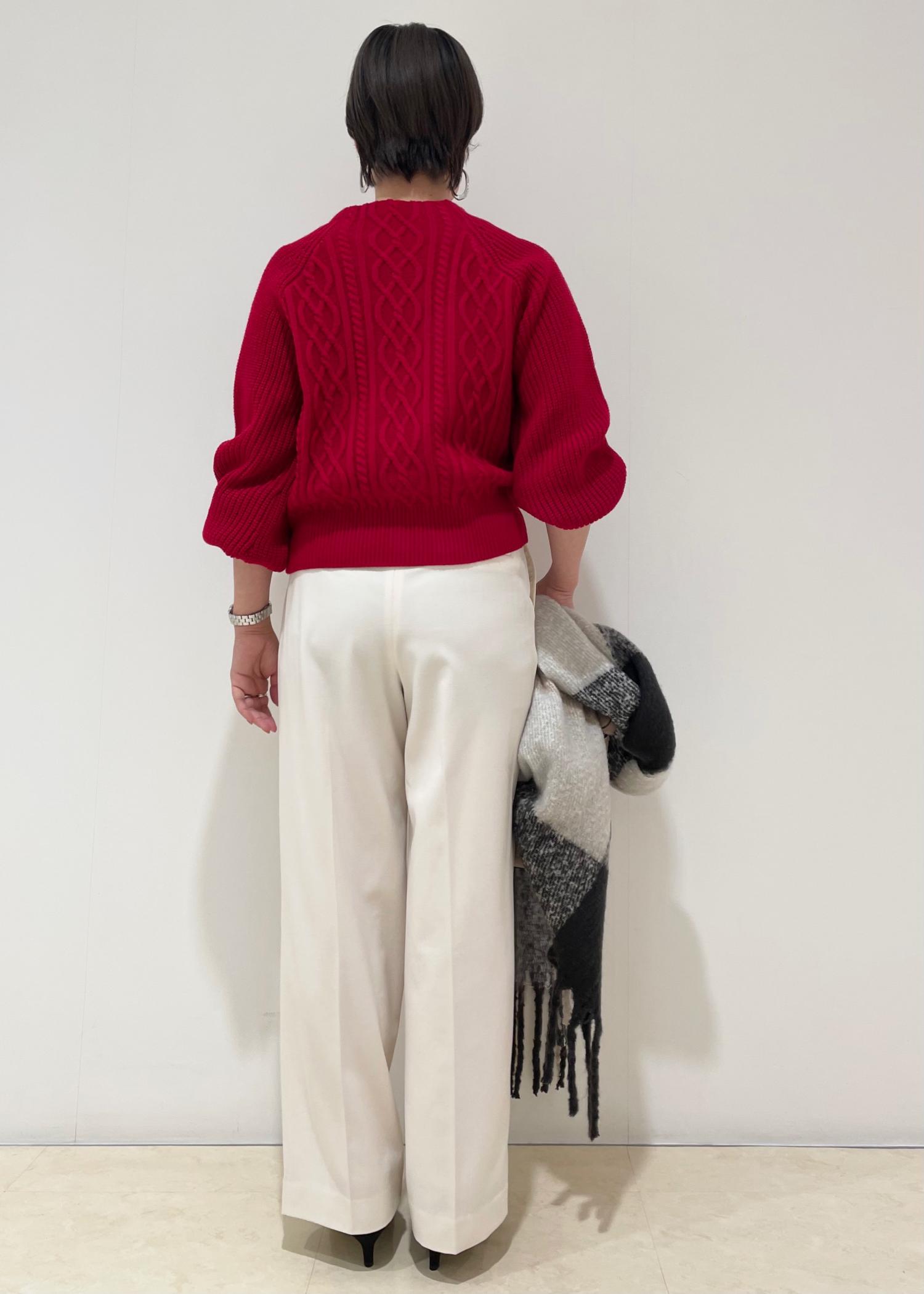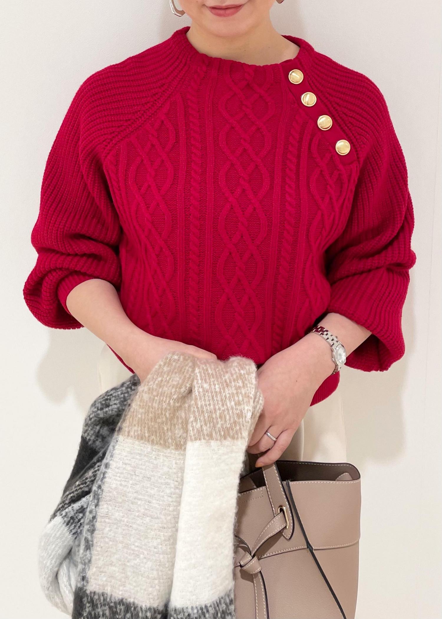 鮮やかな赤がポイントのニットは着るだけで気分も上がるアイテムです☺︎
