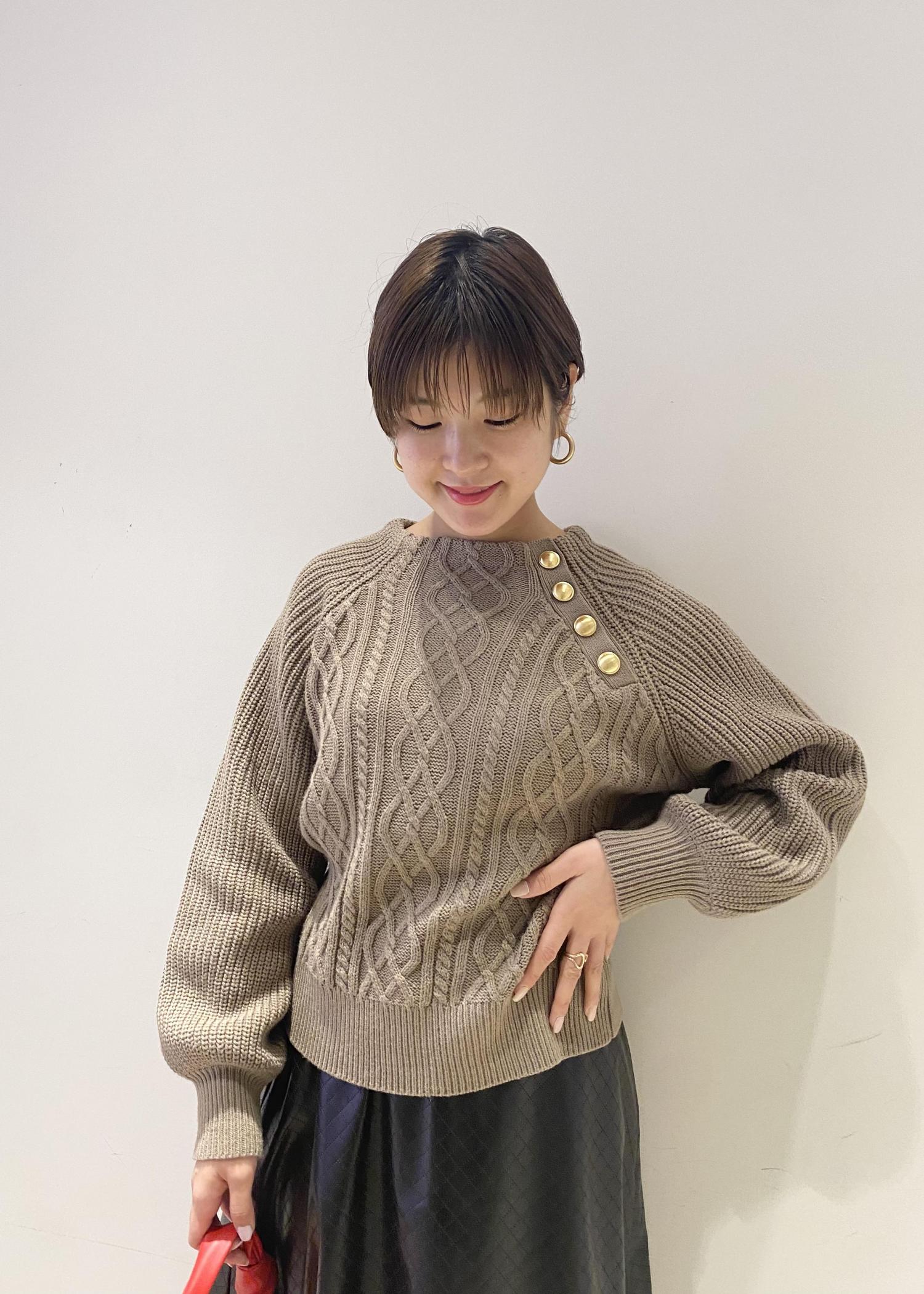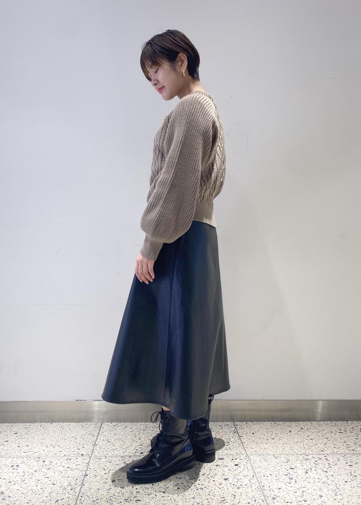 秋らしい上品なベージュとブラックの組み合わせでクールな大人の女性の印象に仕上げました! 胸元のゴールドボタンと一緒に、アクセサリーはゴールドで合わせていただくのがオススメです!