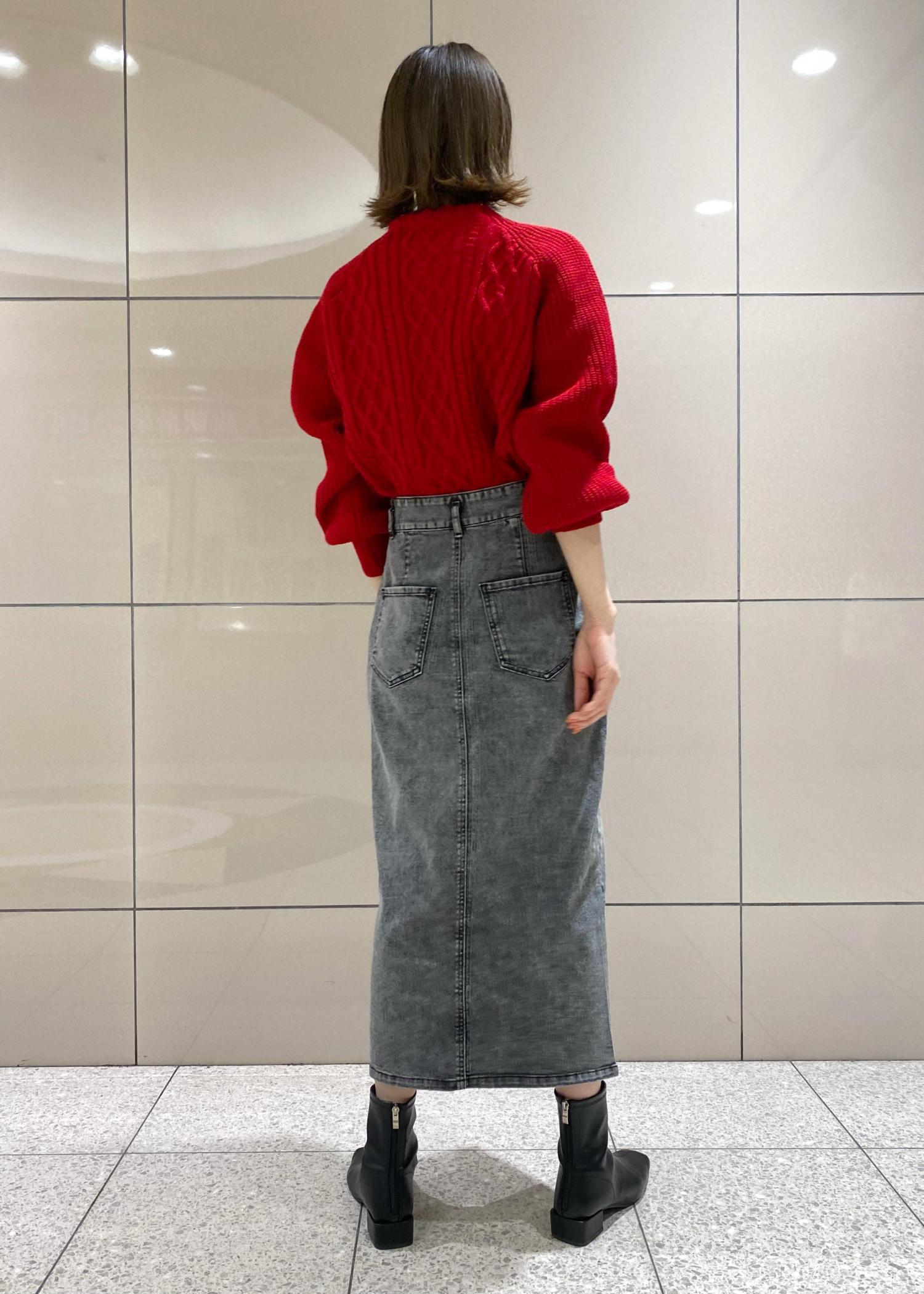 定番のデニムスカートにパッと目を引くカラーニットを合わせていつもと違うコーデに♡