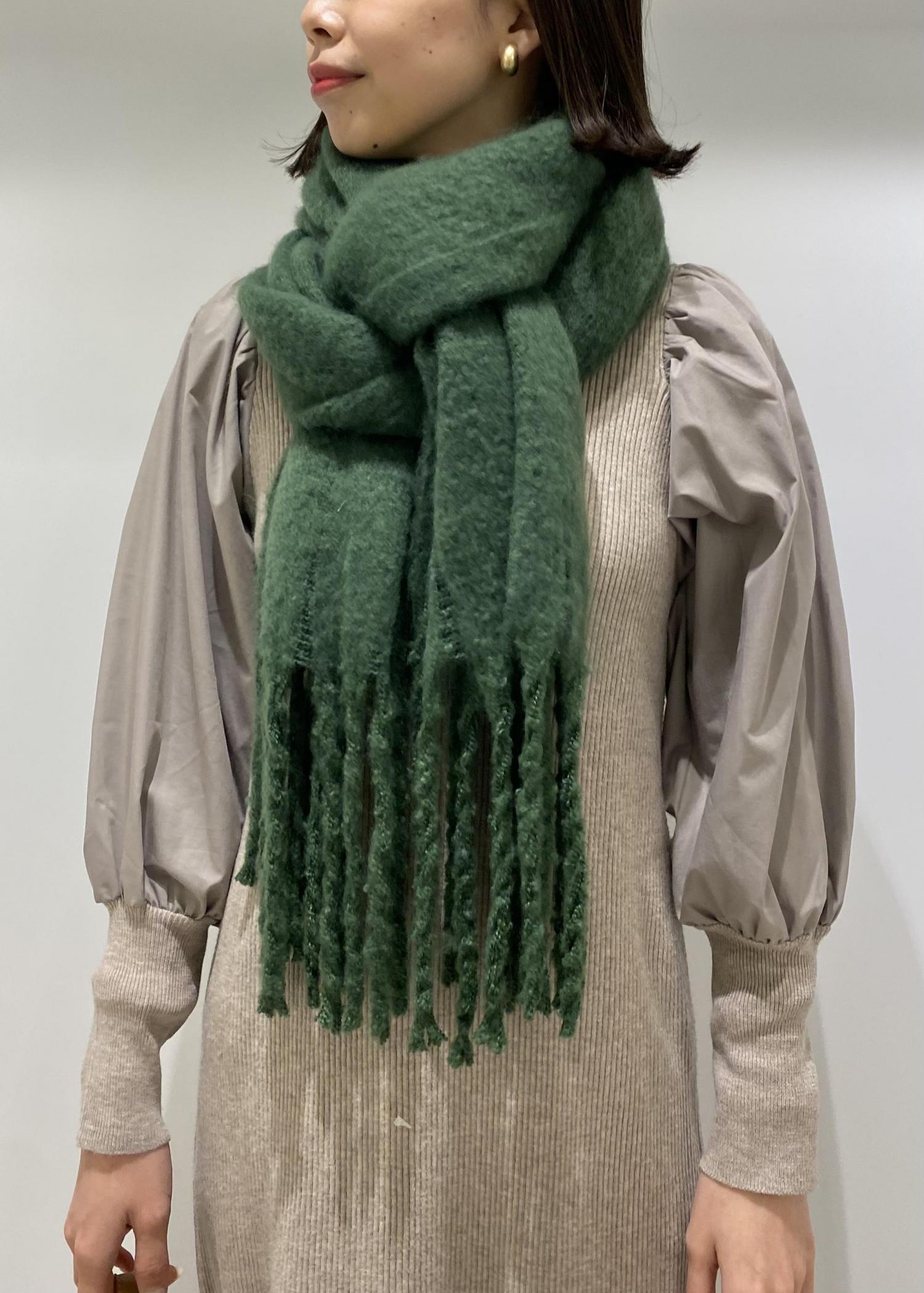 ベーシックカラーのニットワンピースに、差し色としてグリーンのフリンジマフラーを合わせました☺︎ ボリューム感のあるマフラーなので首元までしっかり暖かく真冬に大活躍します! カラーを取り入れるといつもと雰囲気を変えれるので、カラーマフラーオススメです♡ Instagram⇨@vis_diamor