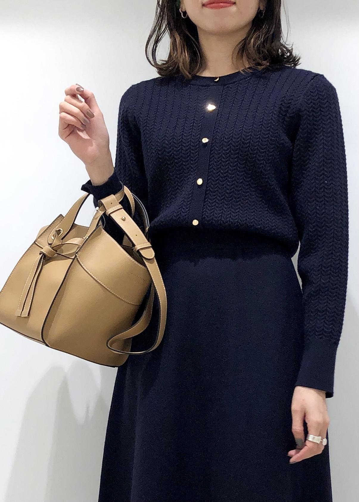 ネイビーをチョイスして軽めカラーの小物を合わせて、春先まで使えるコーディネートに。
