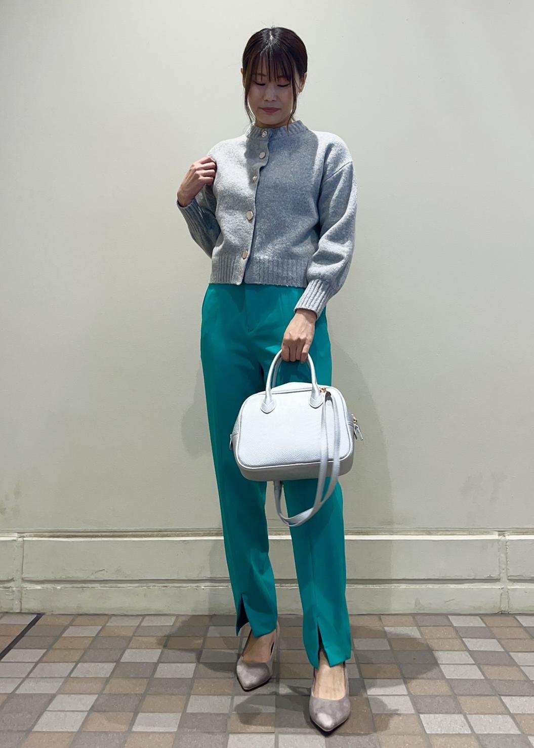 人気のカーディガンに爽やかなグリーンを 合わせたコーデです。 色々釦とボリューム袖が可愛いニットは 羽織りものとしても使えるので着回し抜群です。 トップスは丈が短いのでハイウエストパンツと バランスよく着ていただけます♪