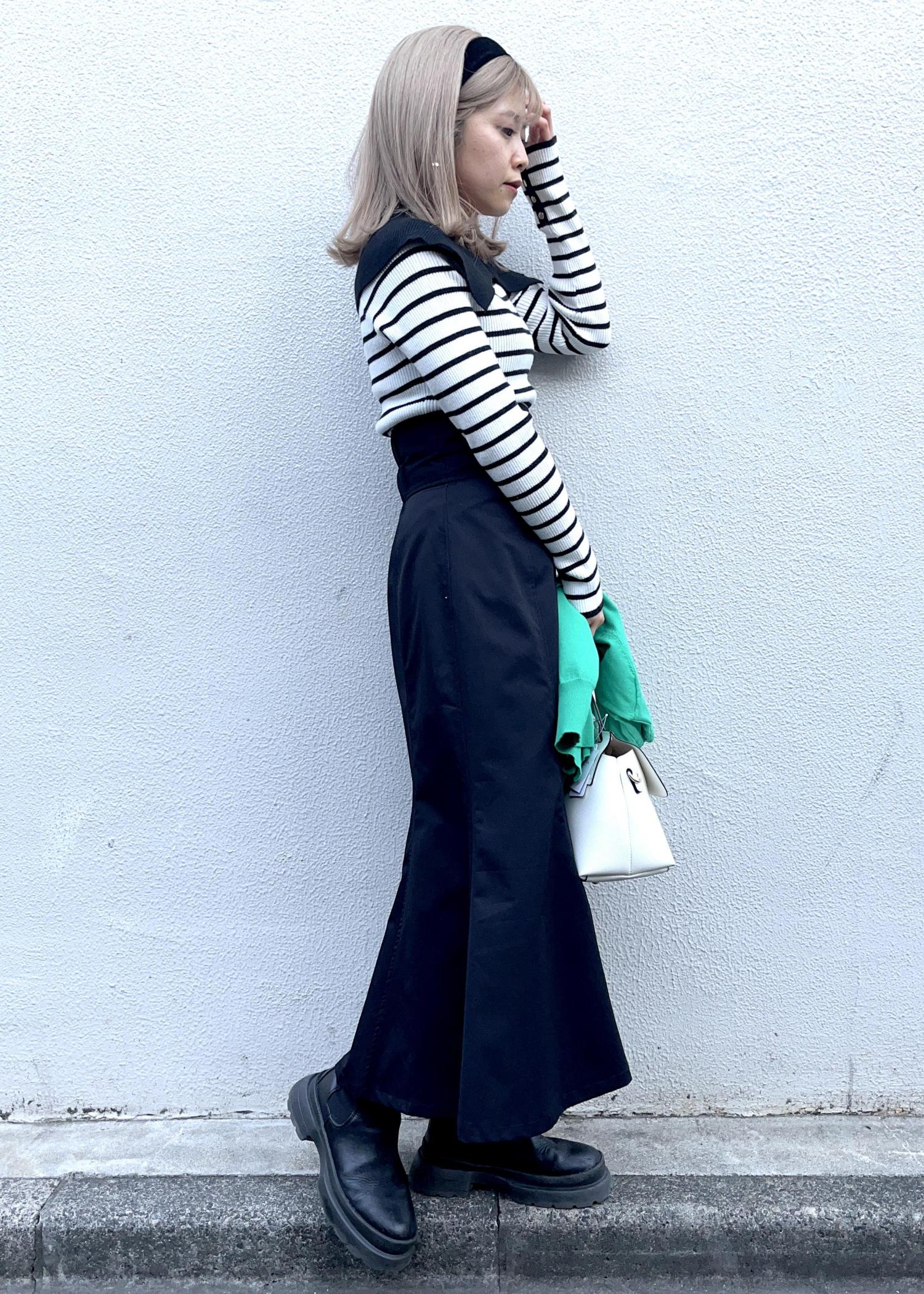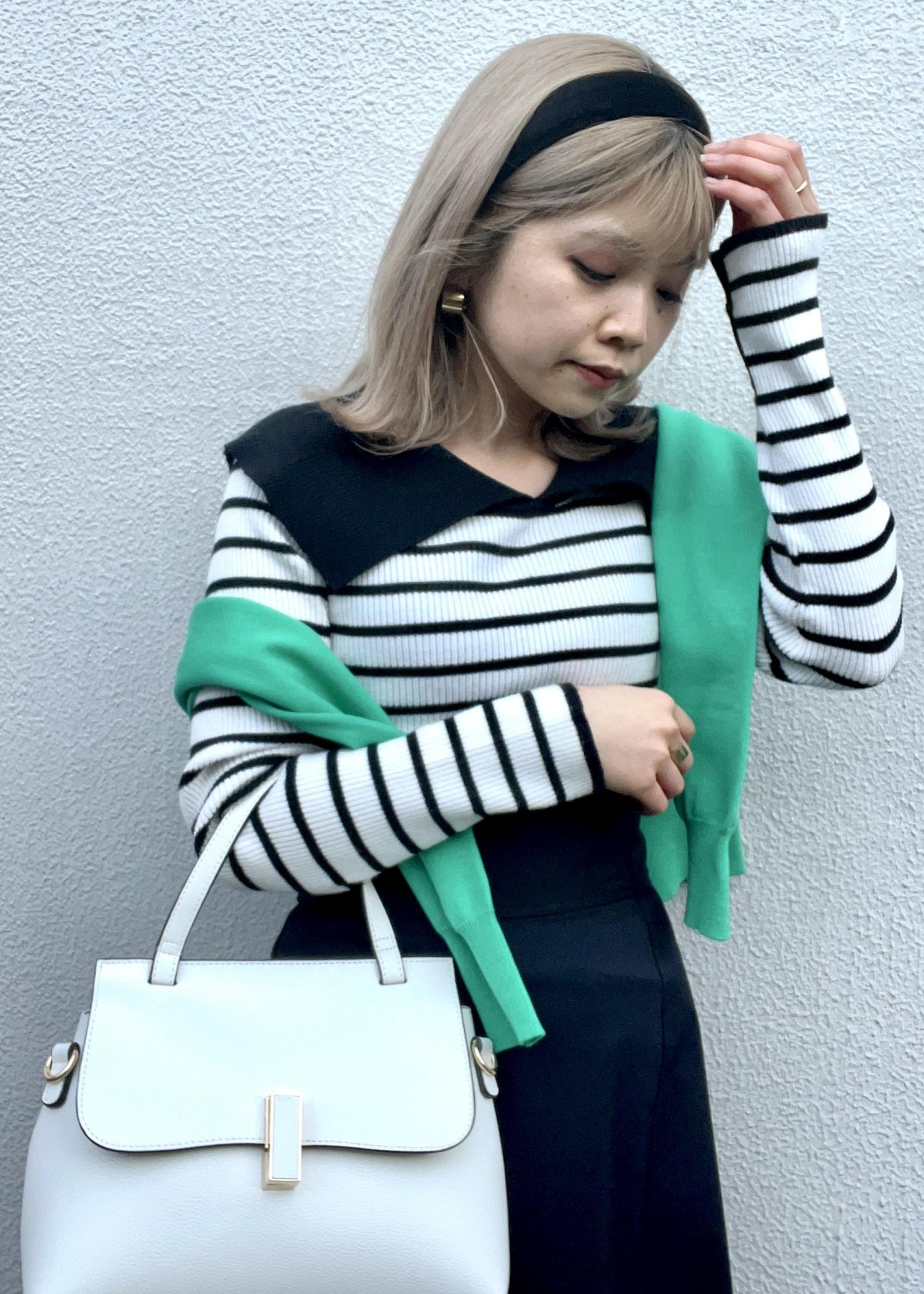 旬なグリーンをアクセントにしたコーデ♪ 春らしさのあるボーダーに、ビッグカラーのトップスは これだけでも着映えす一枚です◎ 甘くなりすぎないよう、モノトーンでまとめました。