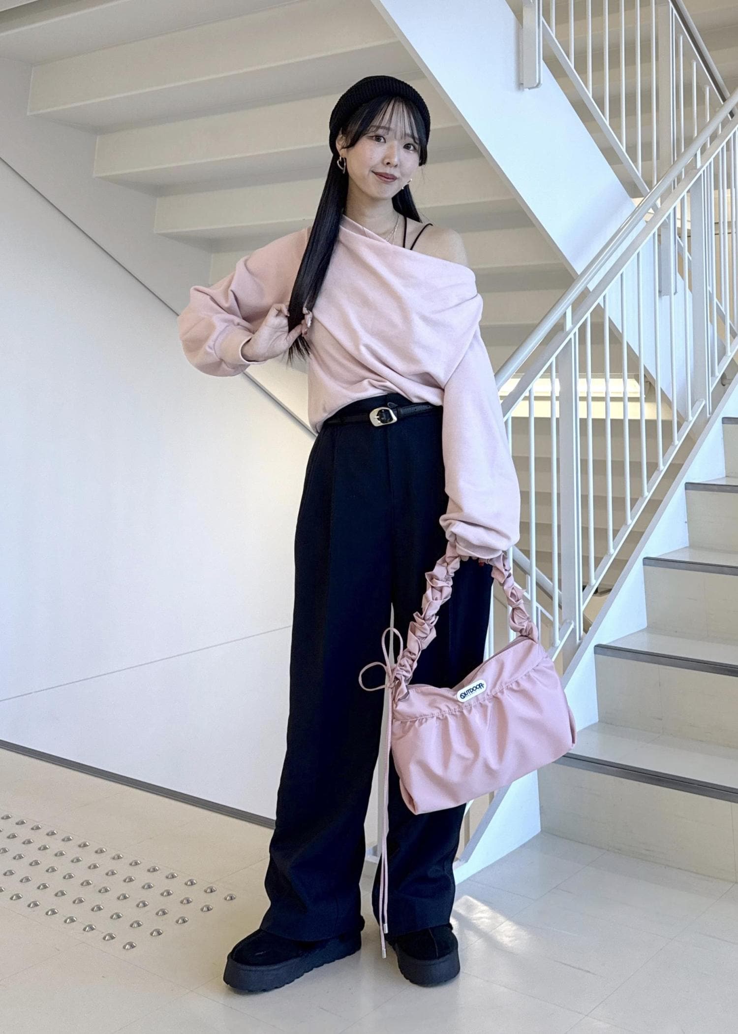 上下が甘めシルエットなので、野暮ったくならないように
