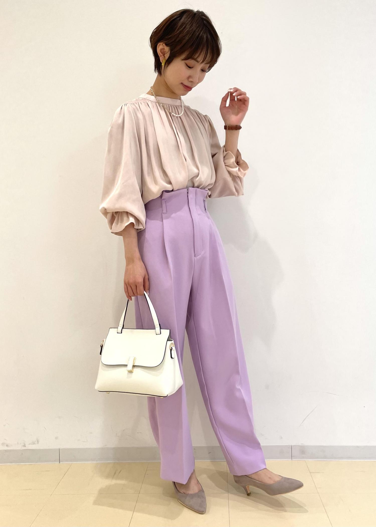 程よい艶感と上品なギャザーデザインのブラウスで、パンツスタイルも女性らしく仕上がります♪