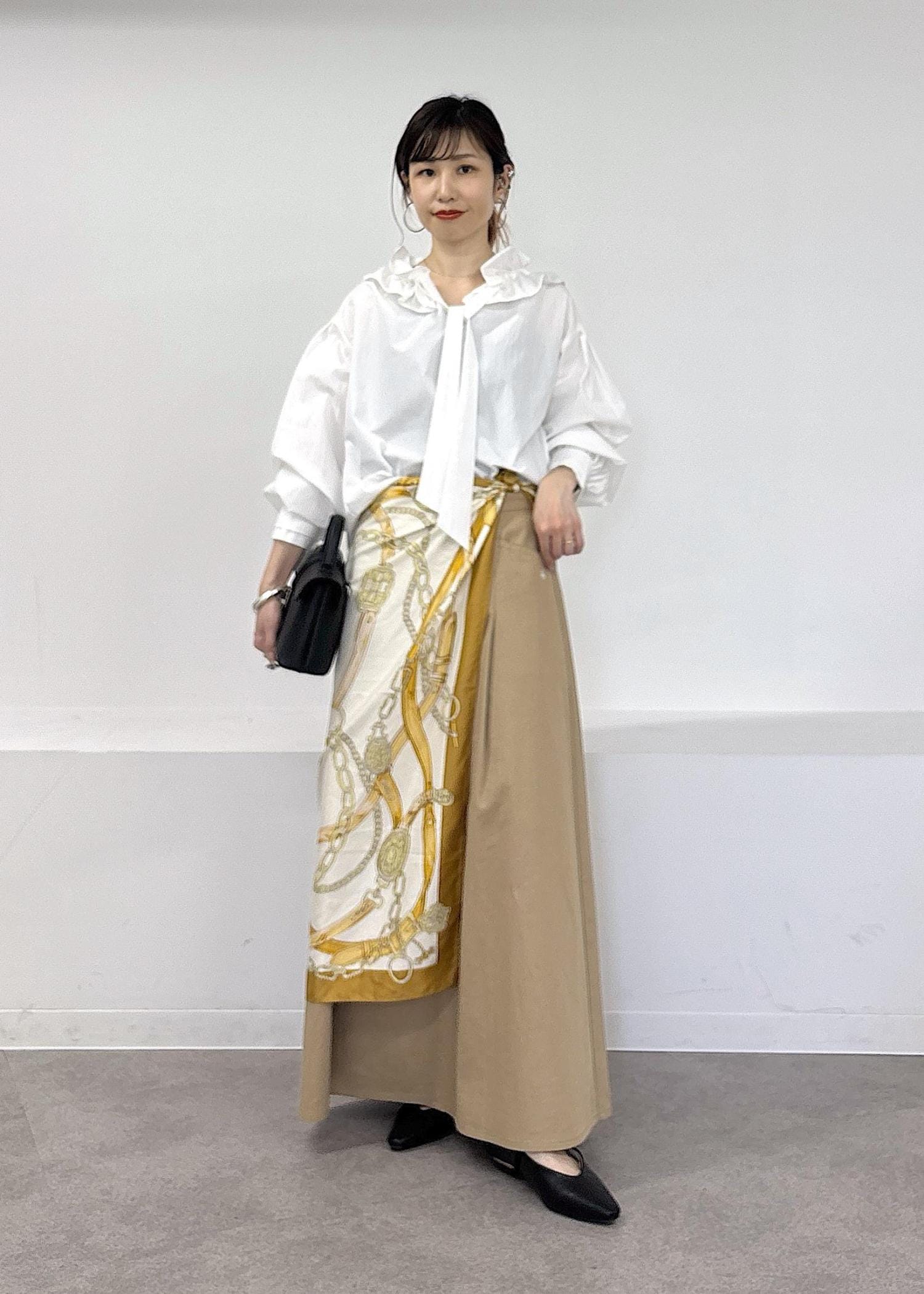 カラー×柄の少し難しそうなスタイリングでも、インナーでのチラ見せだと取り入れやすくなります。